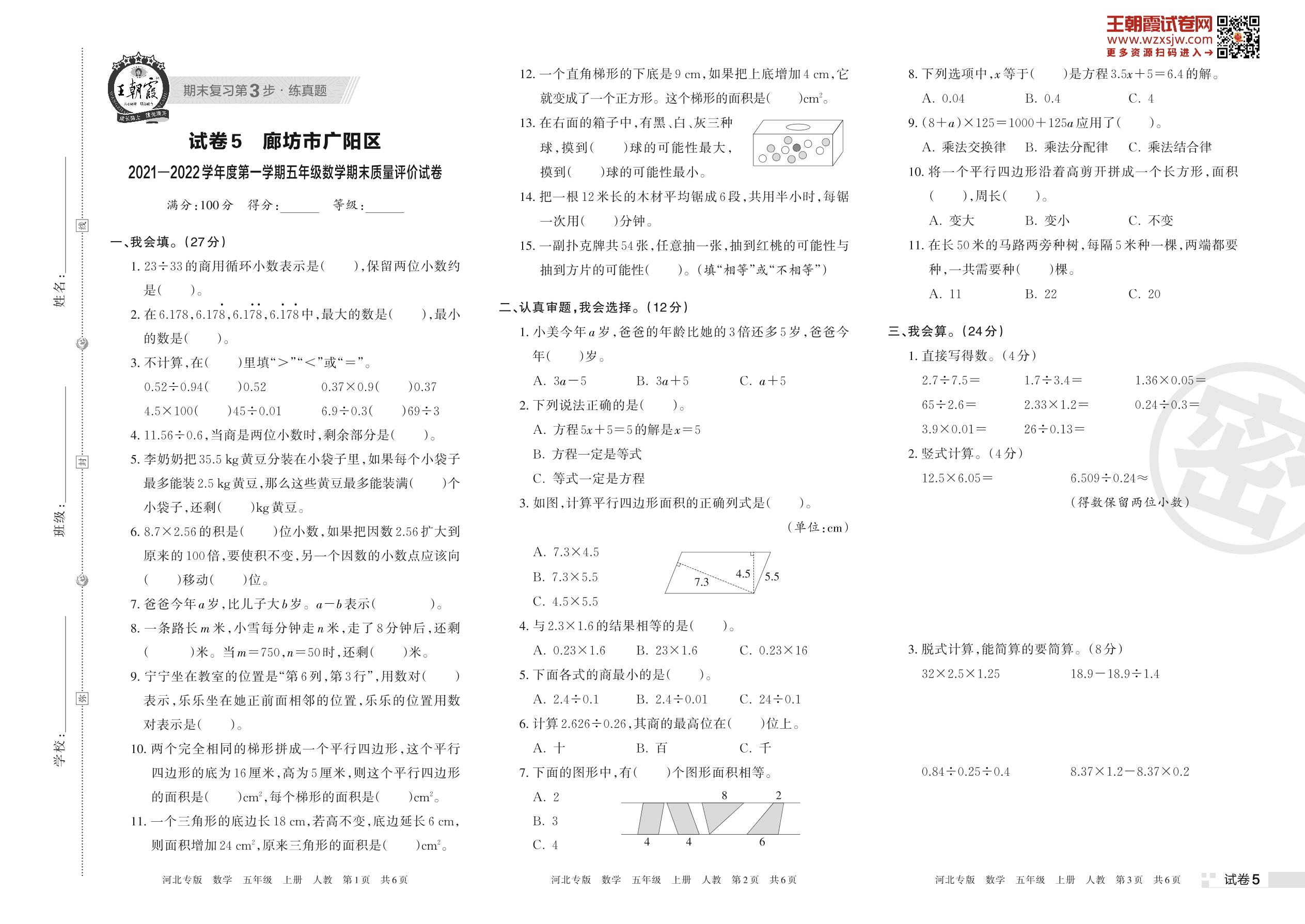 廊坊市广阳区2021—2022学年度第一学期五年级数学期末质量评价试卷(人教版)【5】