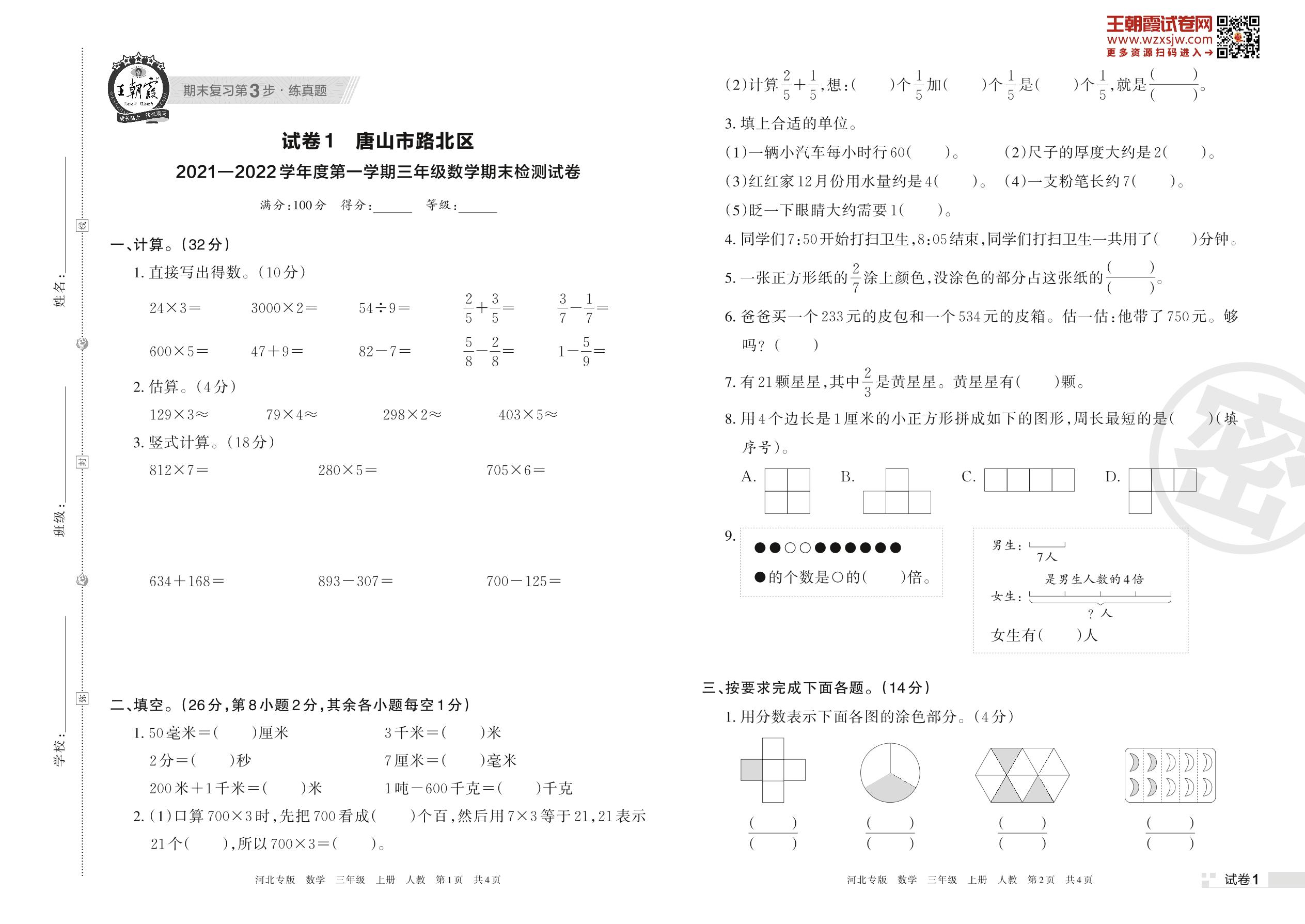 唐山市路北区2021—2022学年度第一学期三年级数学期末检测试卷(人教版)【1】