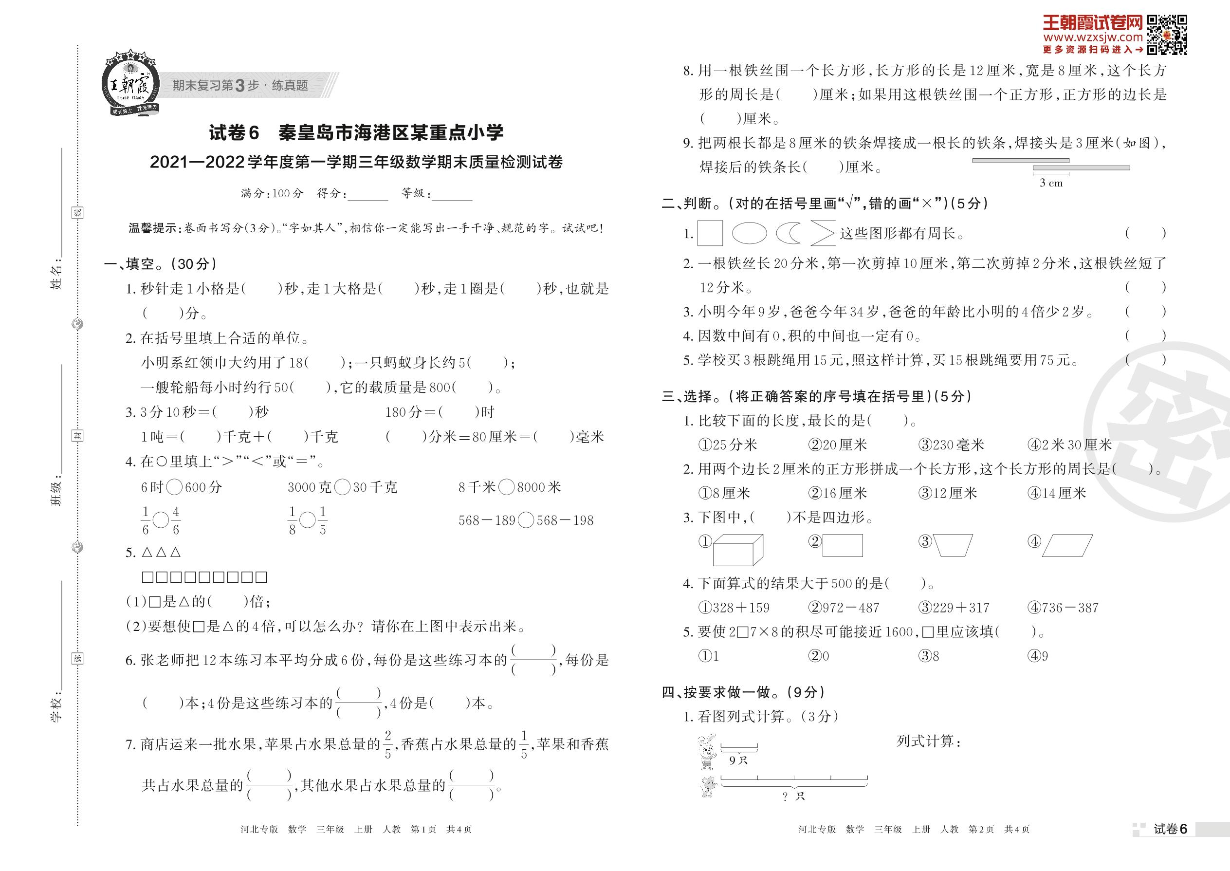 秦皇岛市海港区某重点小学2021—2022学年度第一学期三年级数学期末质量检测试卷(人教版)【6】