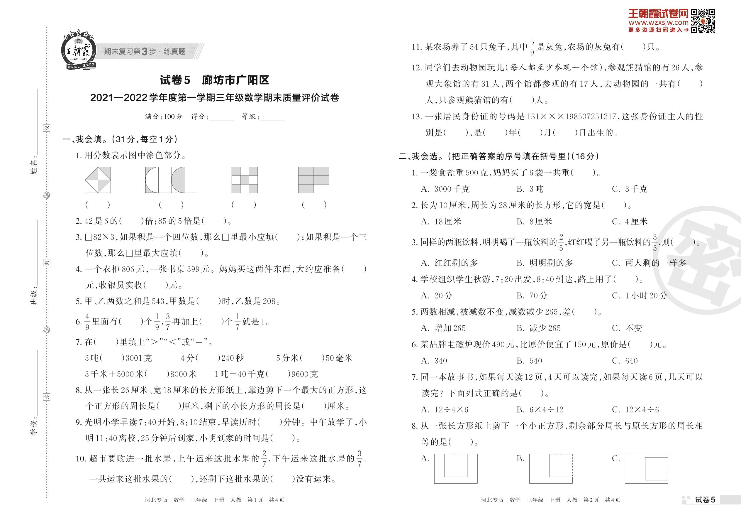 廊坊市广阳区2021—2022学年度第一学期三年级数学期末质量评价试卷(人教版)【5】