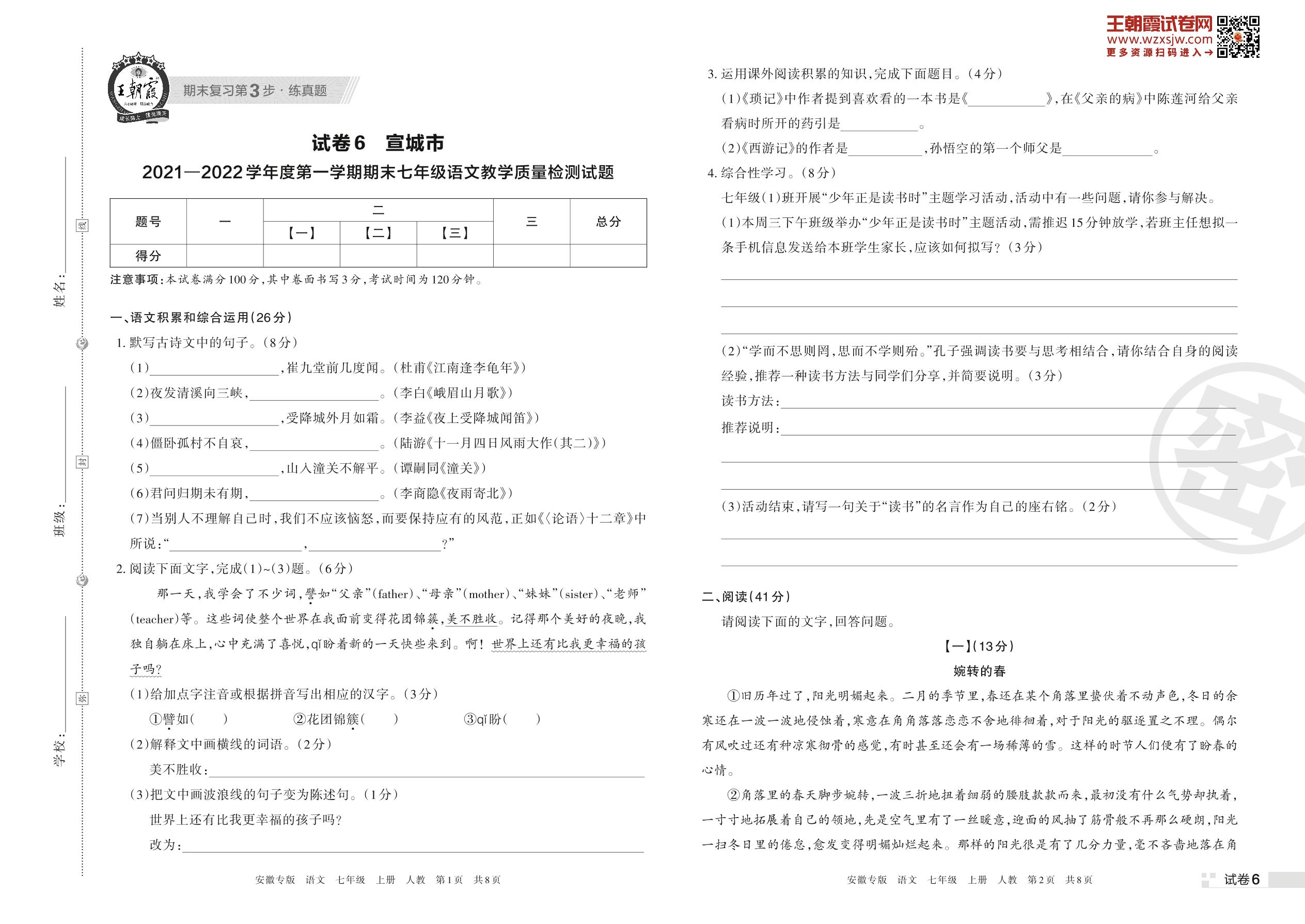 宣城市2021-2022学年度第一学期期末七年级语文教学质量检测试题(人教版)【6】