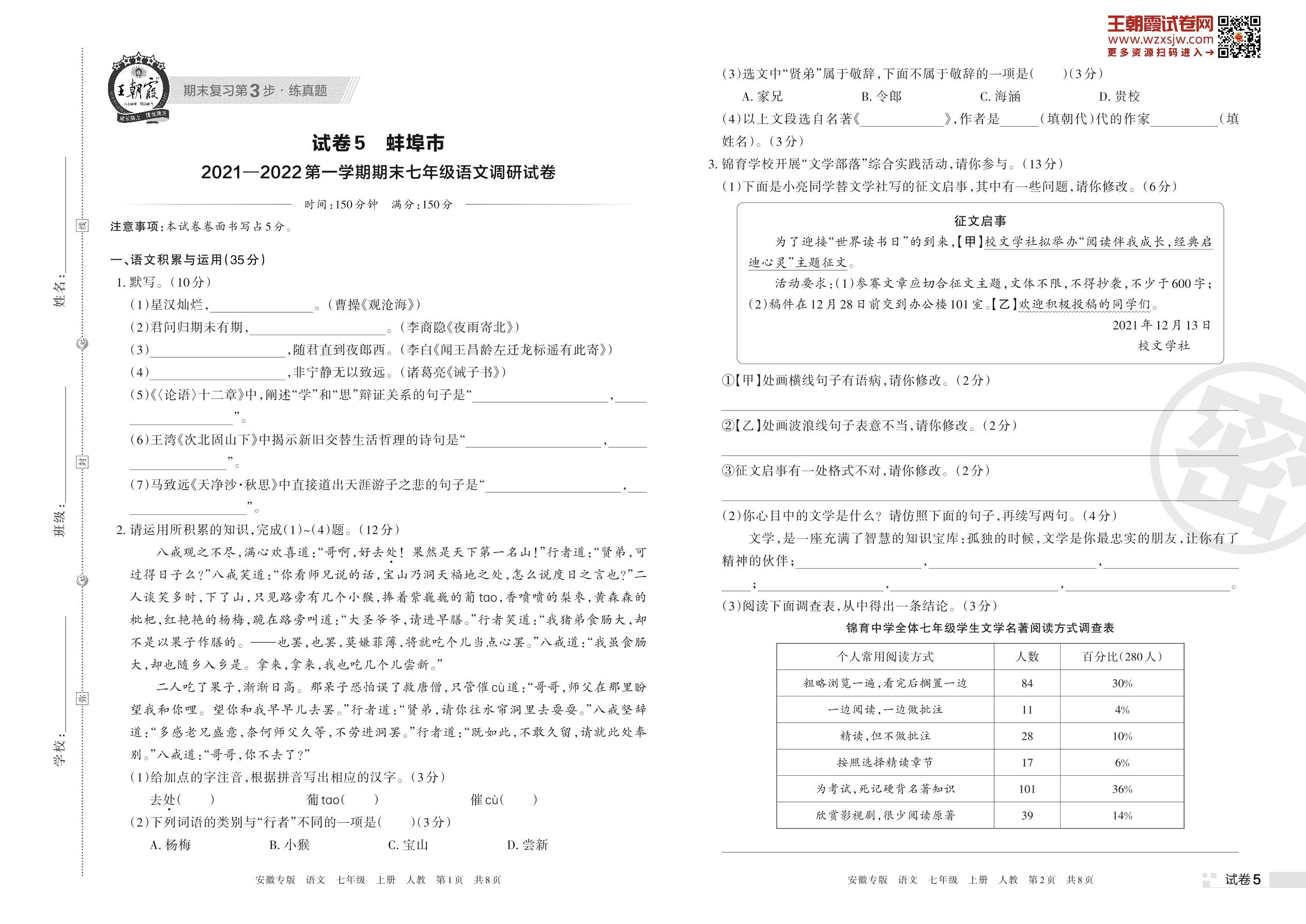 蚌埠市2021-2022第一学期期末七年级语文调研试卷(人教版)【5】