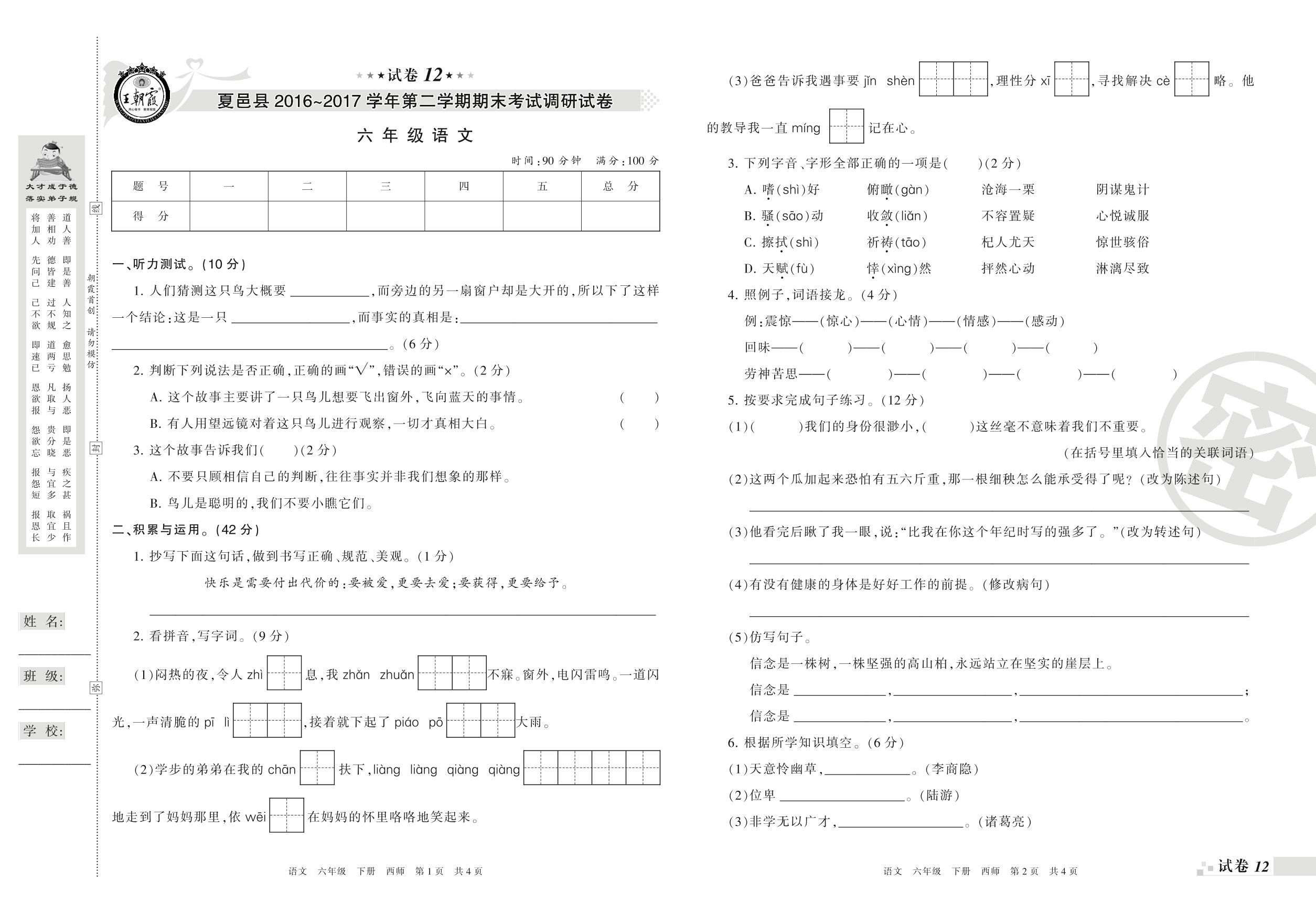 2016-2017学年第二学期商丘市夏邑县六年级语文试卷(西师版)【12】