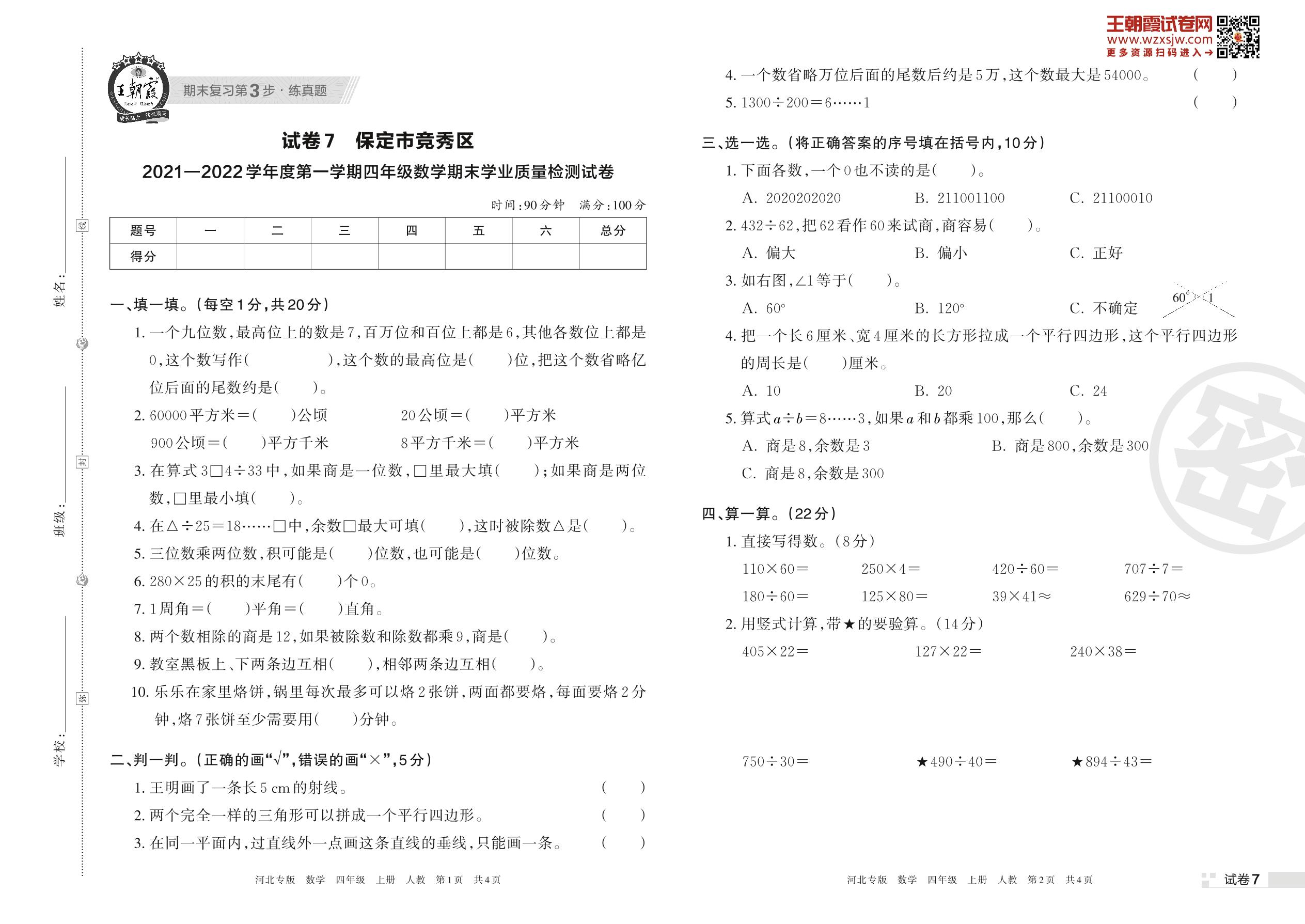 保定市竞秀区2021—2022学年度第一学期四年级数学期末学业质量检测试卷(人教版)【7】