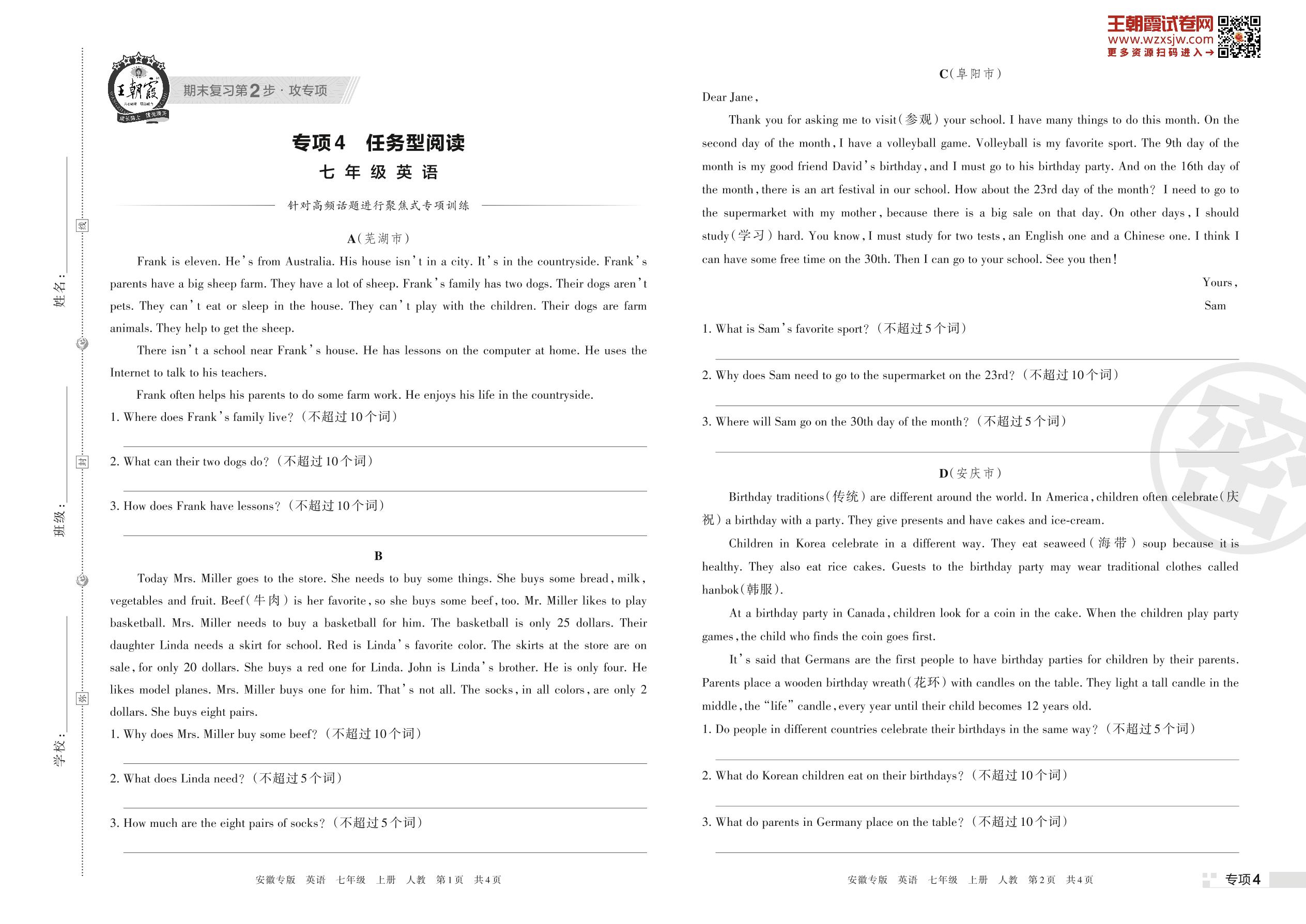 王朝霞期末专项卷——任务型阅读七年级上册英语(人教版)【4】