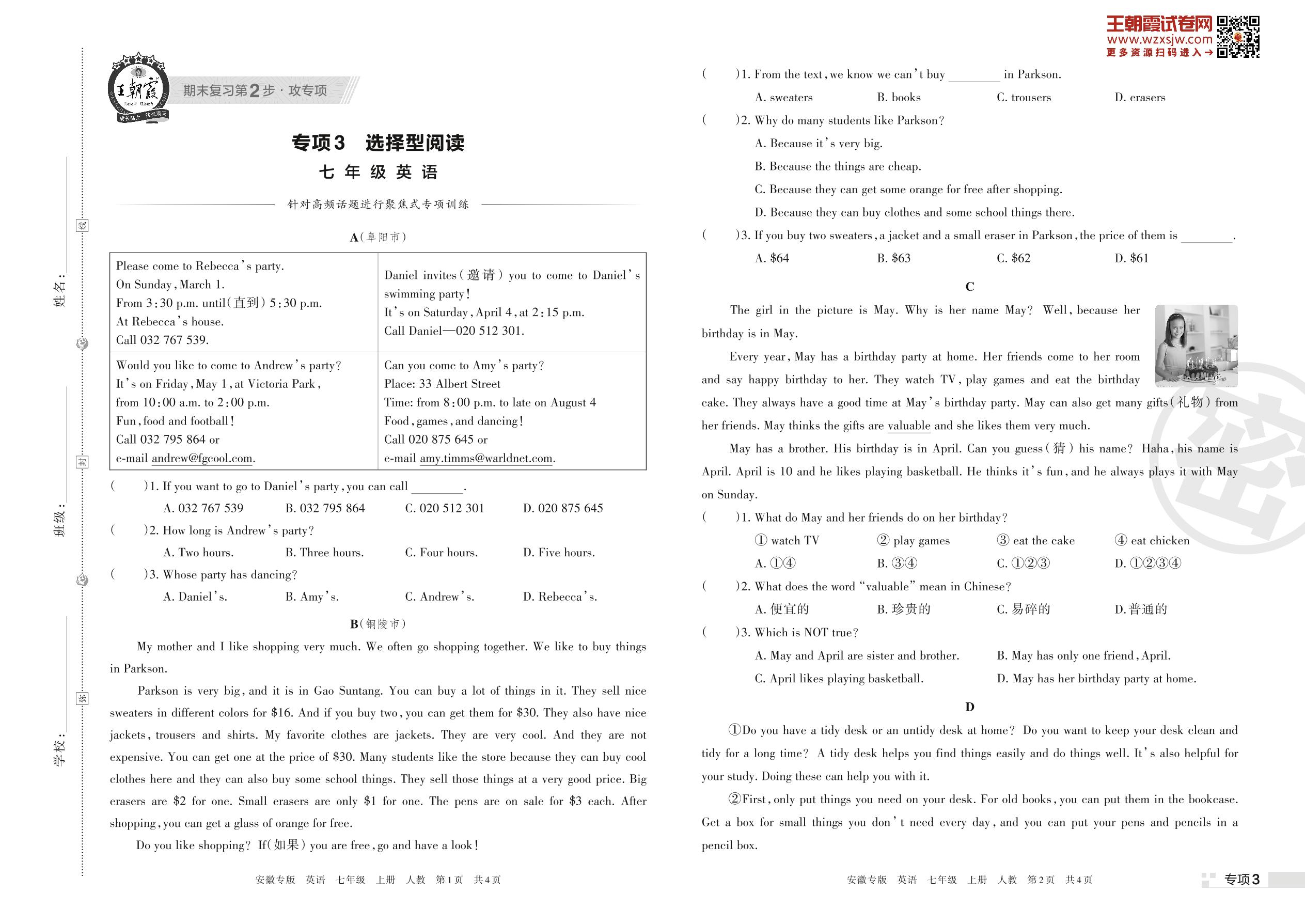 王朝霞期末专项卷——选择型阅读七年级上册英语(人教版)【3】