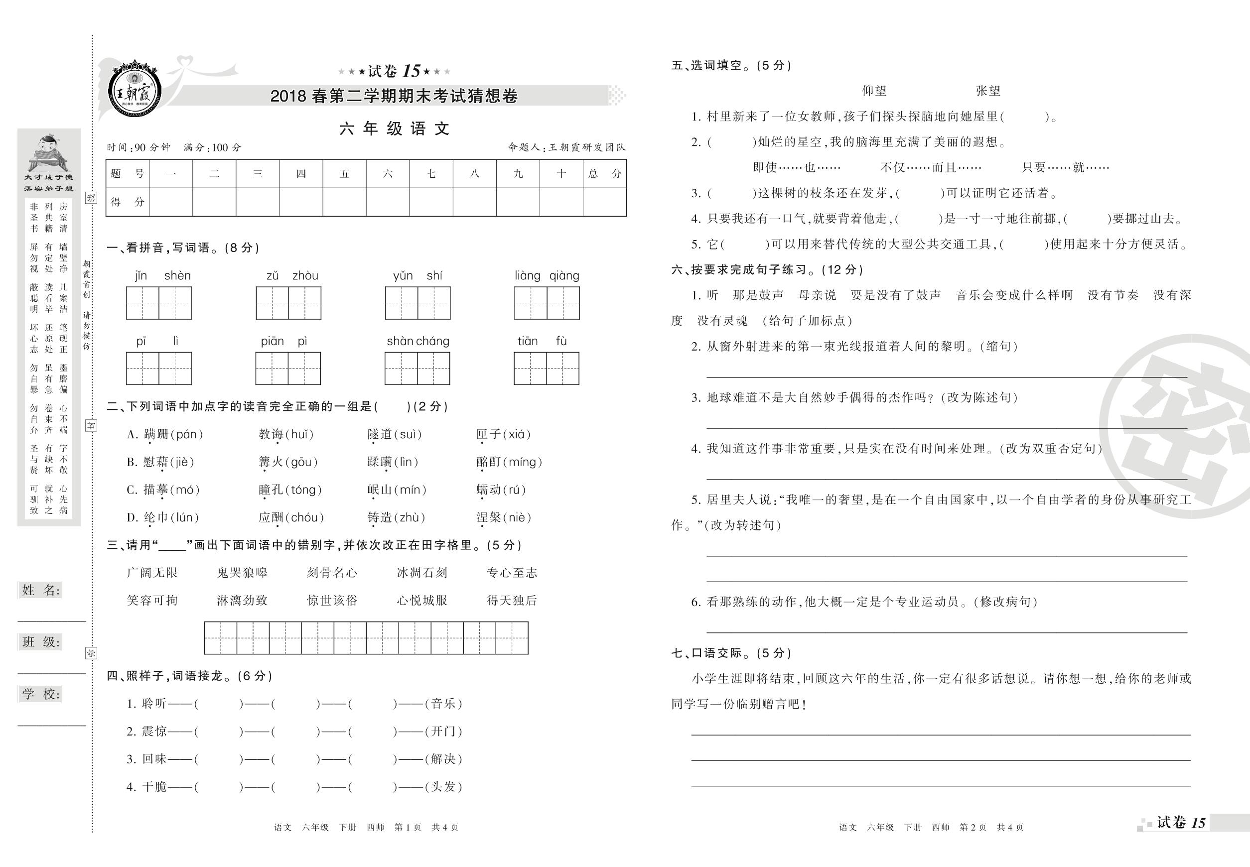 王朝霞期末猜想卷六年级下册语文(西师版)【15】