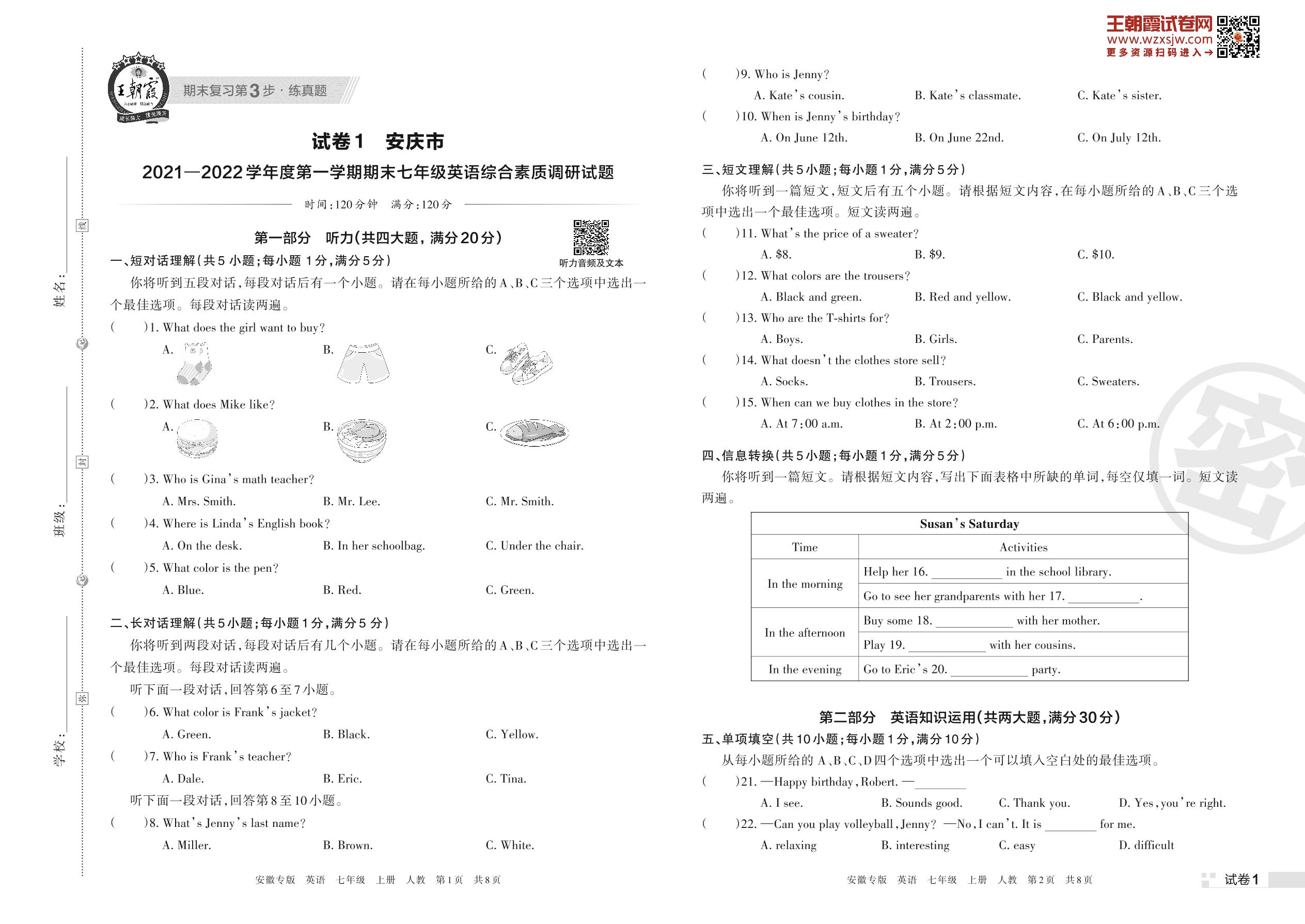 安庆市某外国语中学2021—2022学年度第一学期期末七年级英语综合素质调研题(人教版)【1】