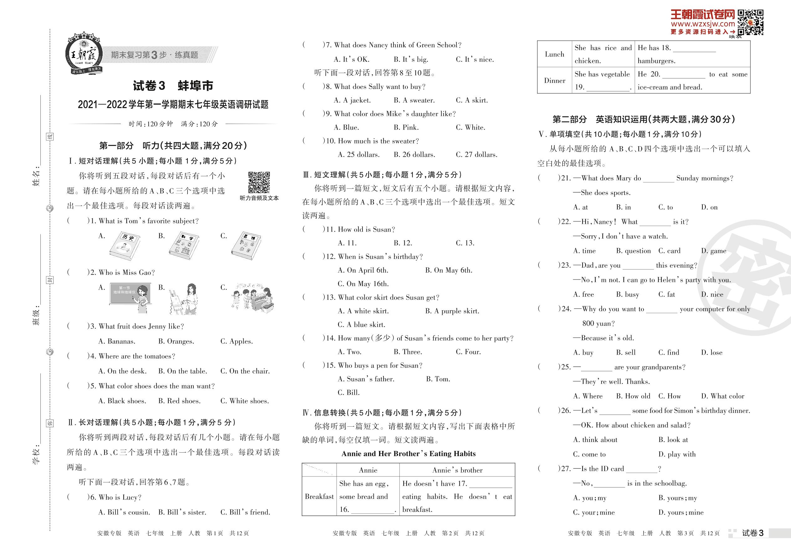 蚌埠市2021—2022学年第一学期期末七年级英语调研试题(人教版)【3】