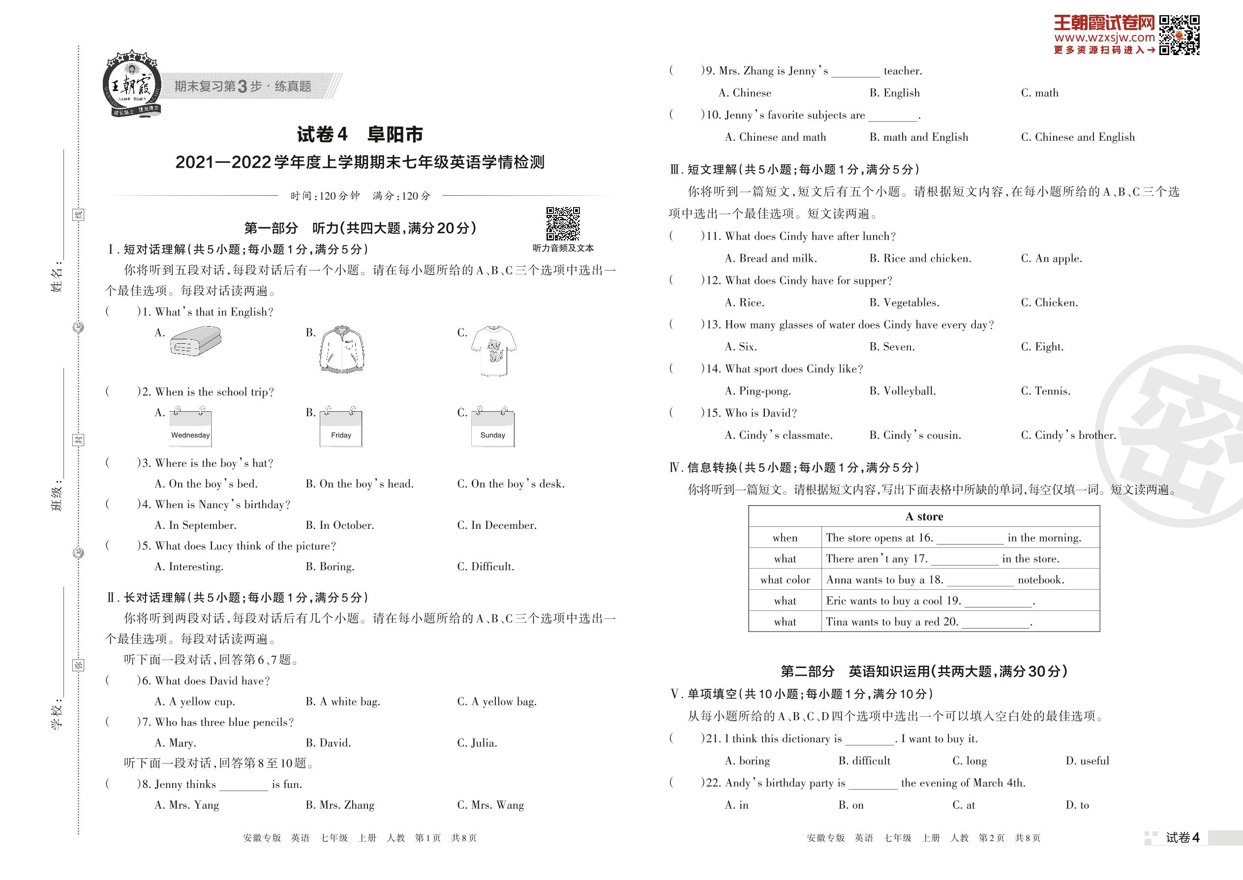 阜阳市2021—2022学年度上学期期末七年级英语学情检测(人教版)【4】