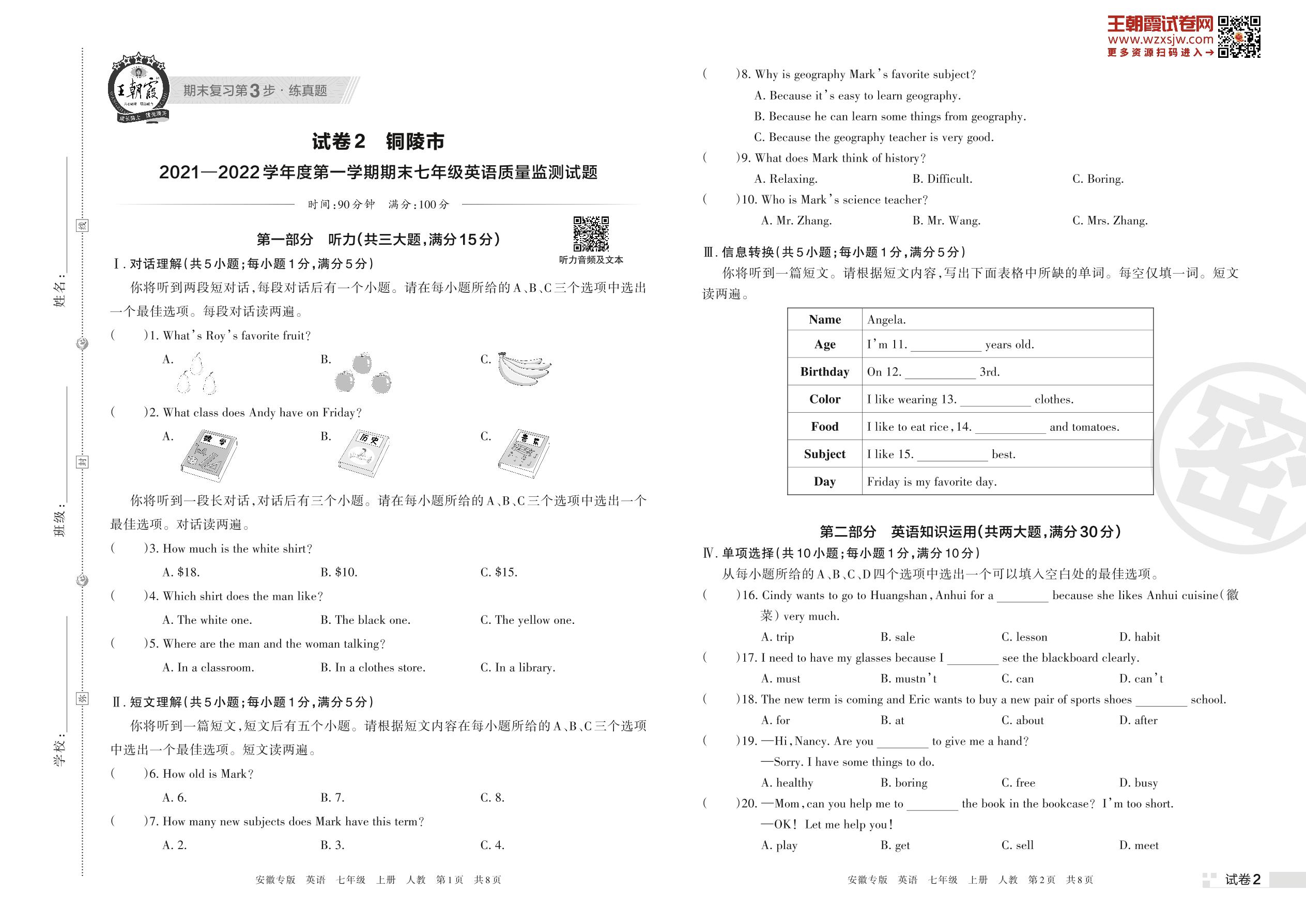 铜陵市2021—2022学年度第一学期期末七年级英语质量监测试题(人教版)【2】
