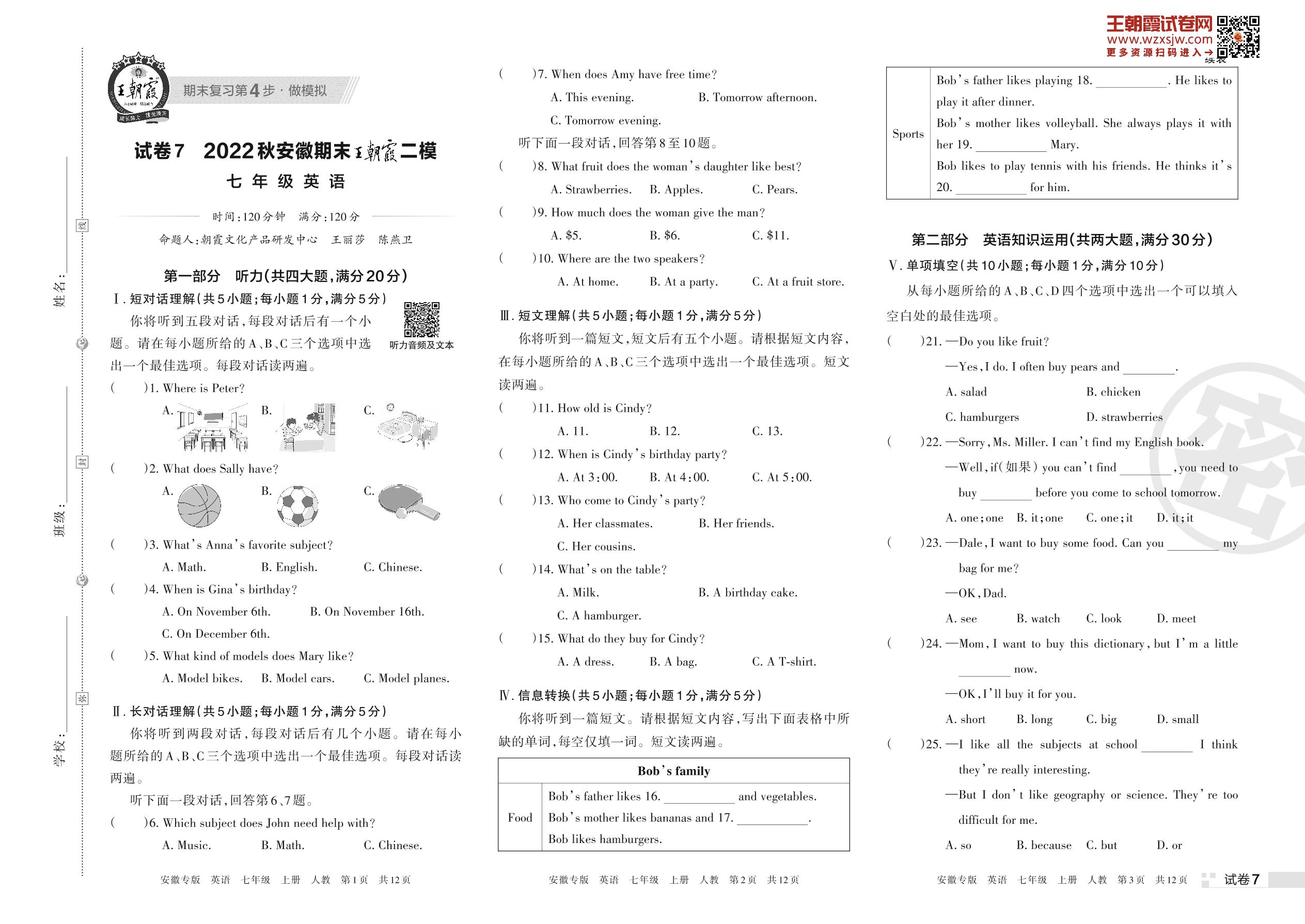 王朝霞期末模拟卷七年级上册英语(人教版)_R221124152011018【7】