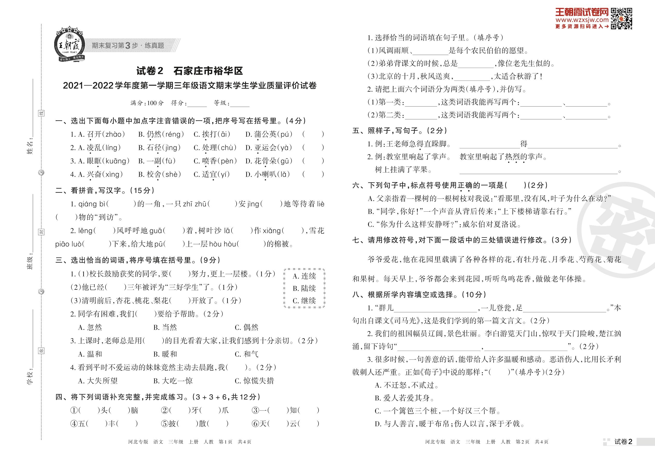 石家庄市裕华区2021—2022学年度第一学期三年级语文期末学生学业质量评价试卷(人教版)【2】