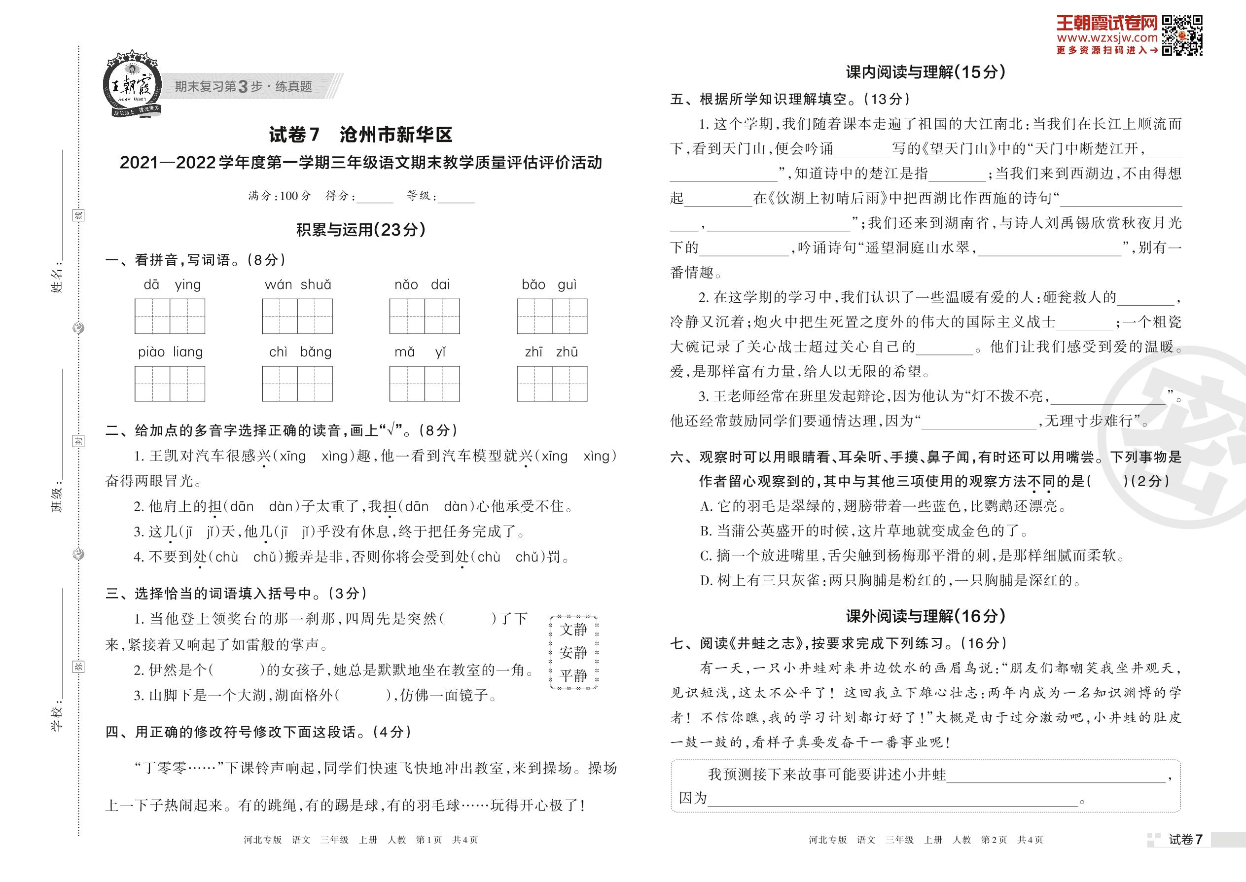 沧州市新华区2021—2022学年度第一学期三年级语文期末教学质量评估评价活动(人教版)【7】