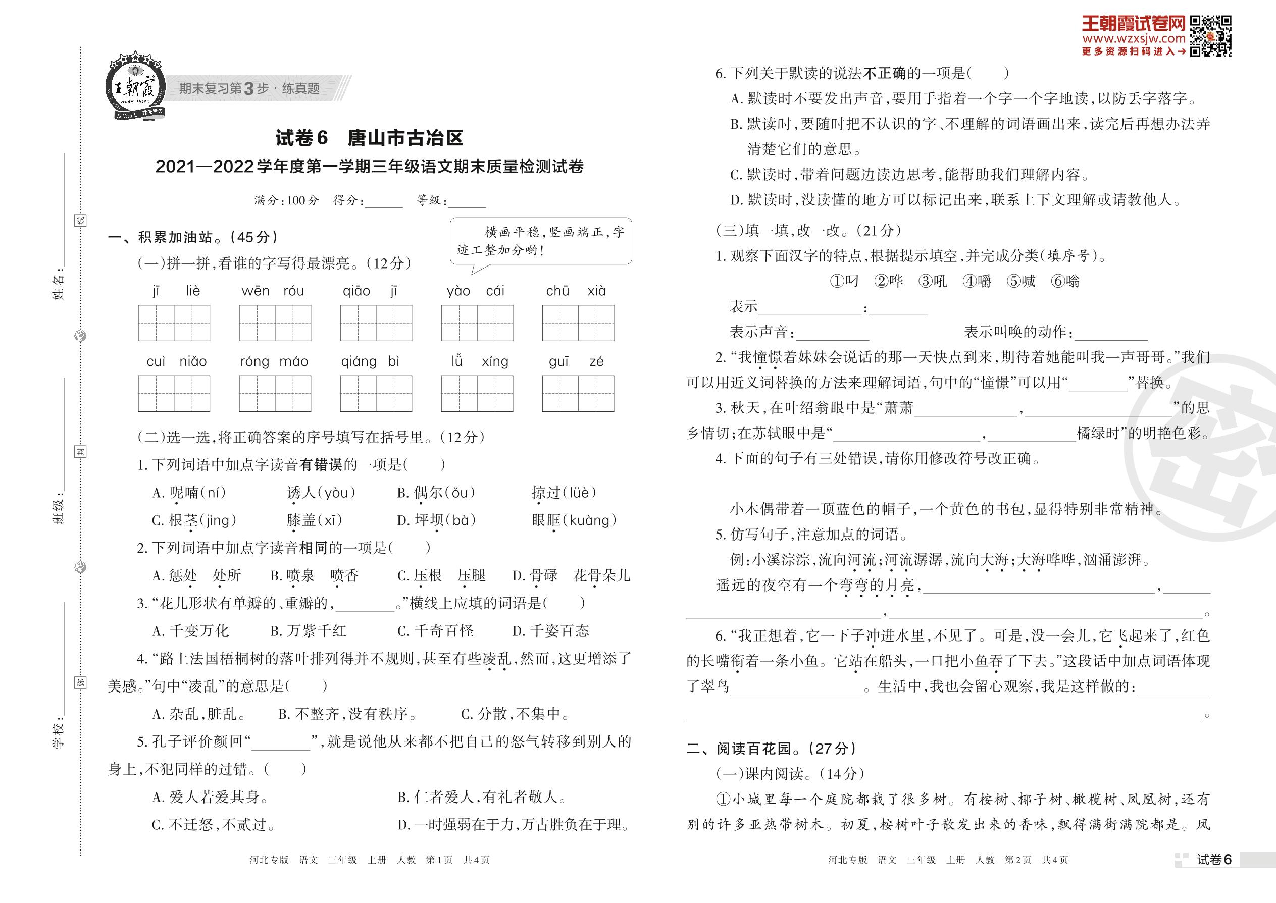 唐山市古冶区2021—2022学年度第一学期三年级语文期末质量检测试卷(人教版)【6】