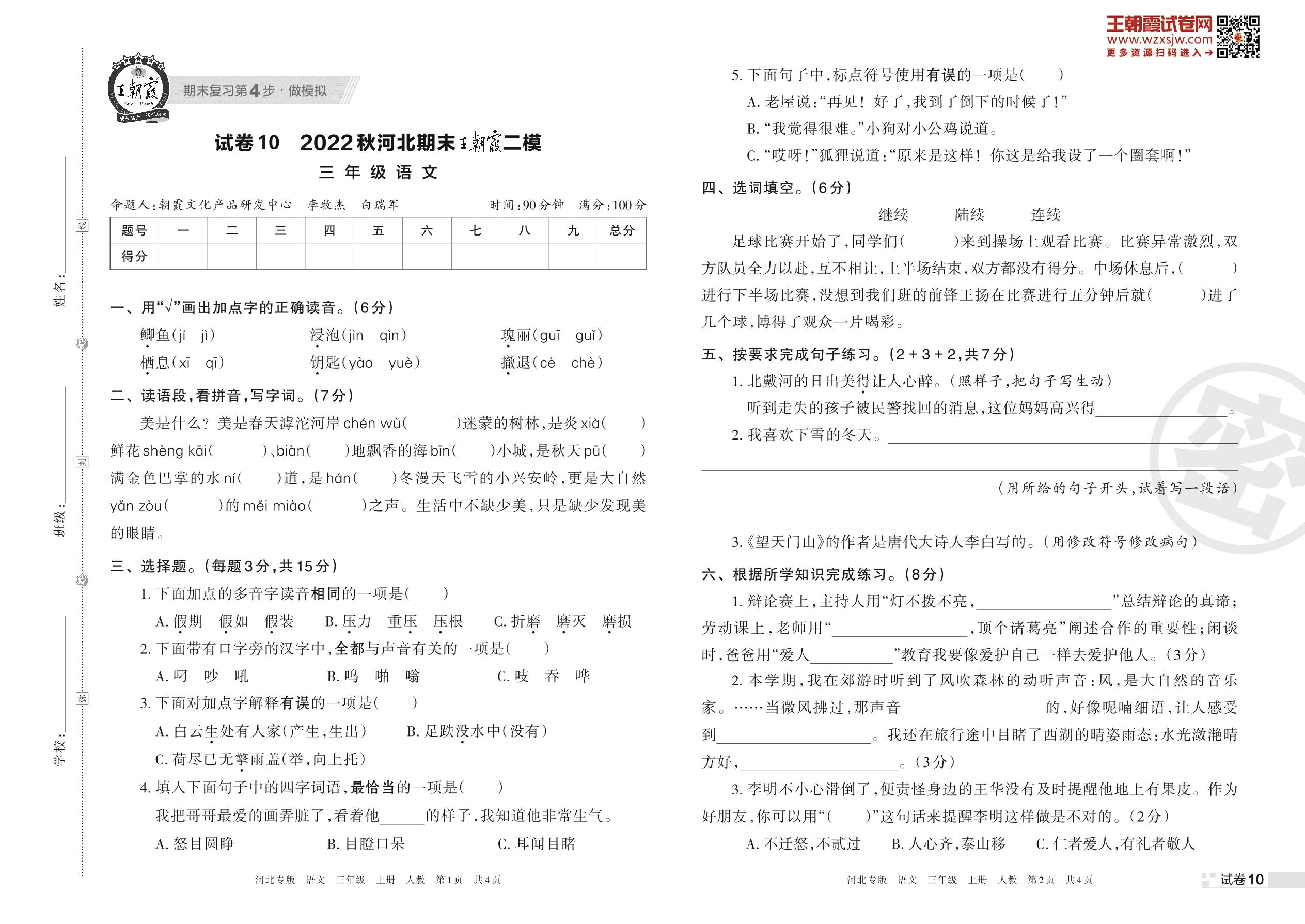 王朝霞期末模拟卷三年级上册语文(人教版)_R221124152701495【10】