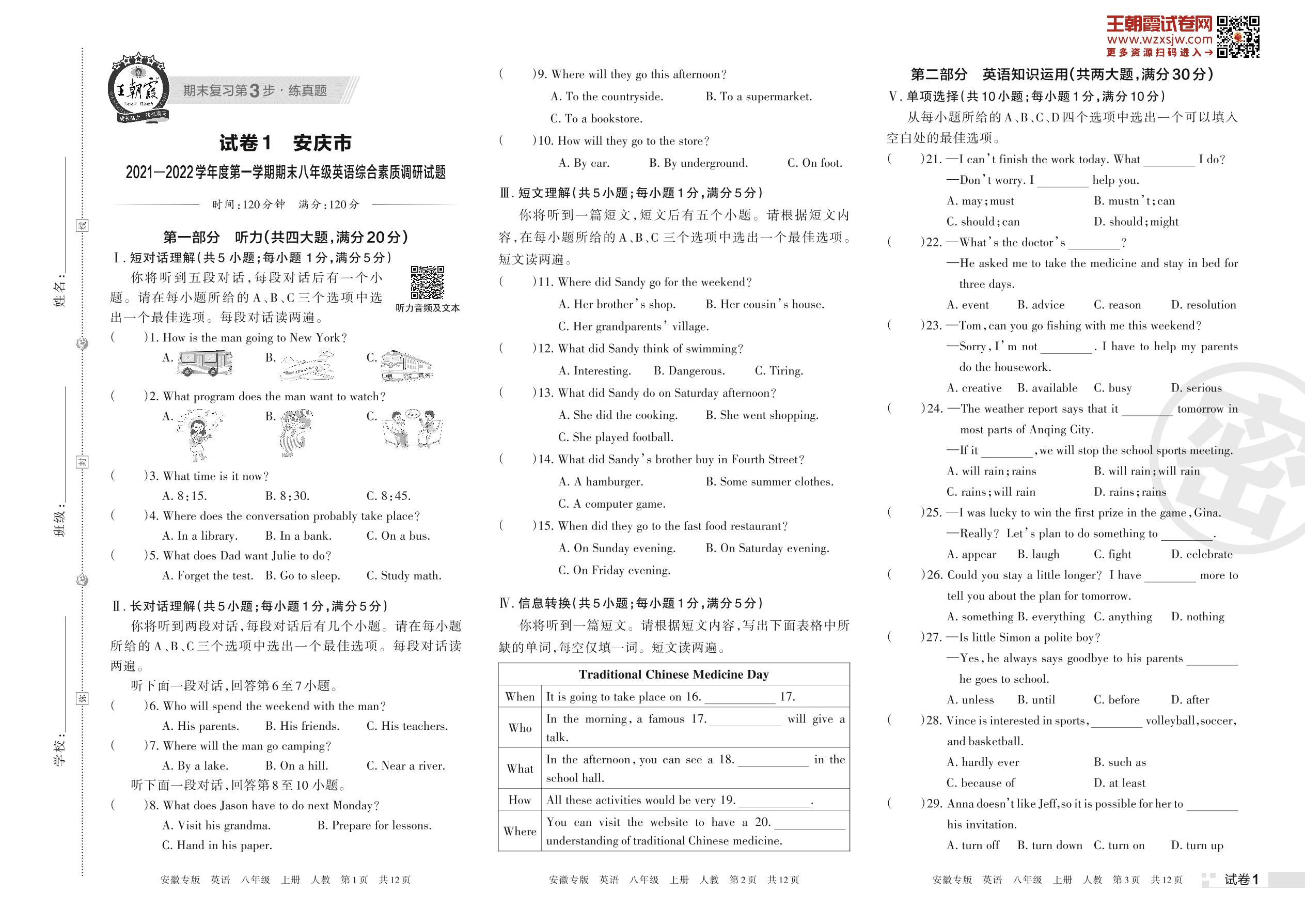 安庆市某外国语中学2021—2022学年度第一学期期末八年级英语综合素质调研试题(人教版)【1】