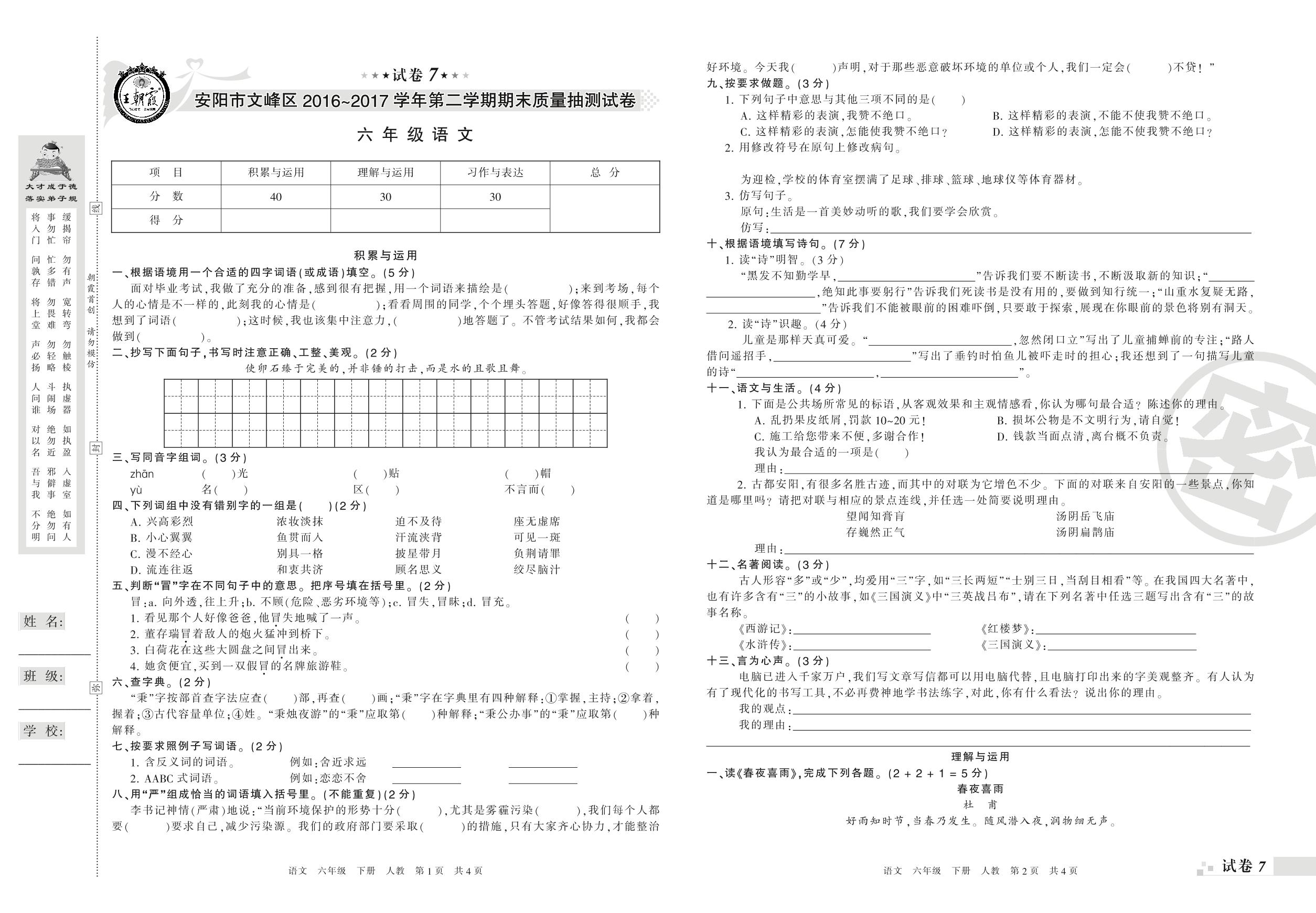 2016-2017学年第二学期安阳市文峰区六年级语文试卷(人教版)【7】