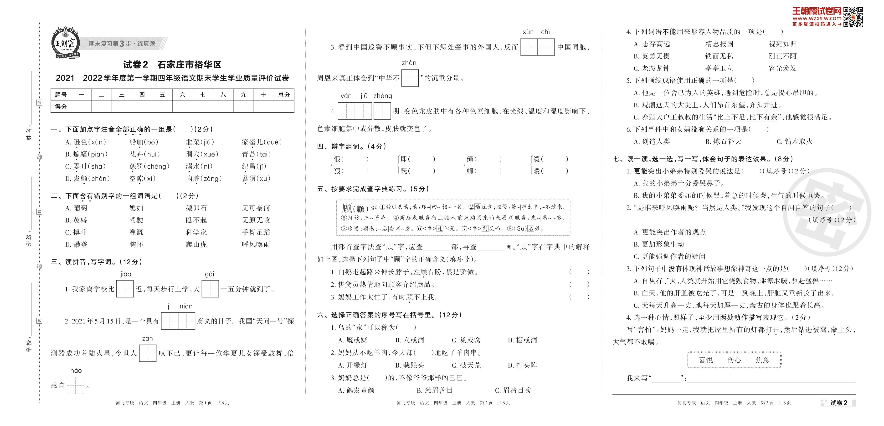 石家庄市裕华区2021—2022学年度第一学期四年级语文期末学生学业质量评价试卷(人教版)【2】