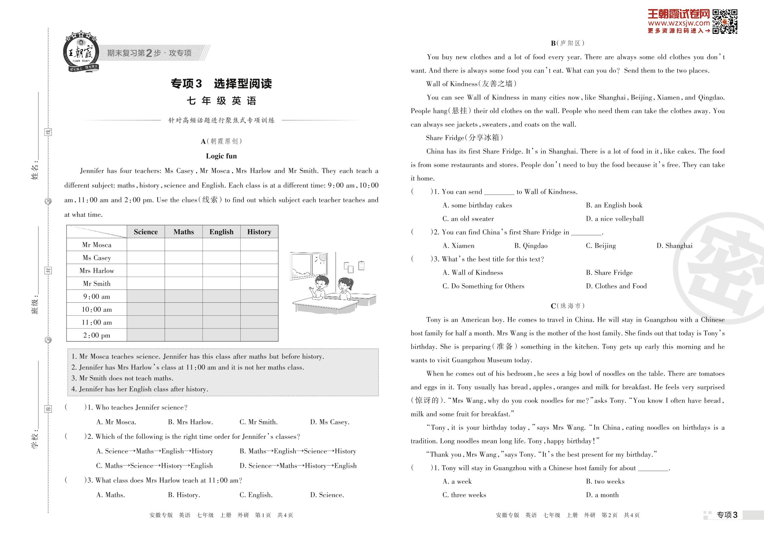 王朝霞期末专项卷——选择型阅读七年级上册英语(外研版)【3】