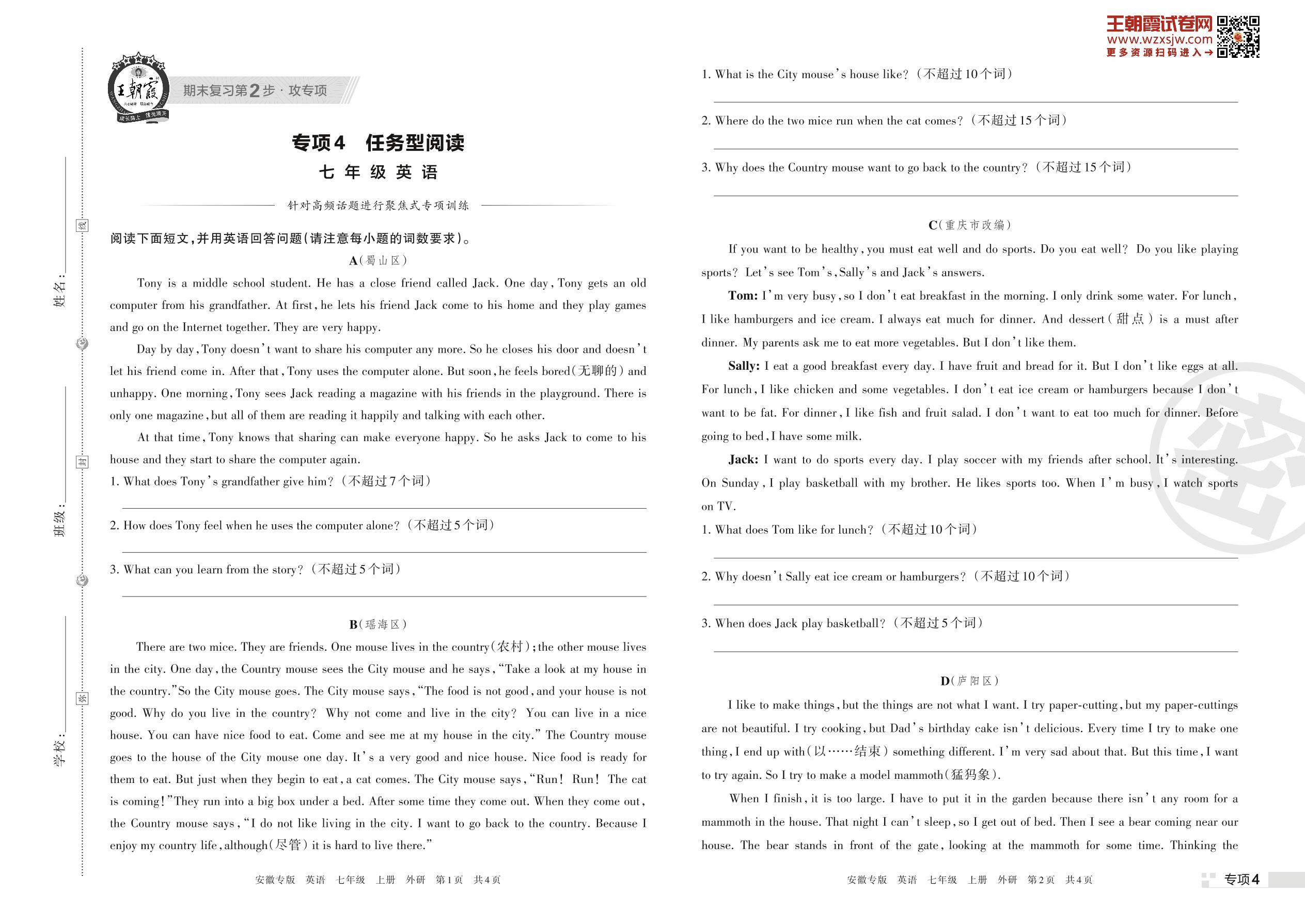 王朝霞期末专项卷——任务型阅读七年级上册英语(外研版)【4】