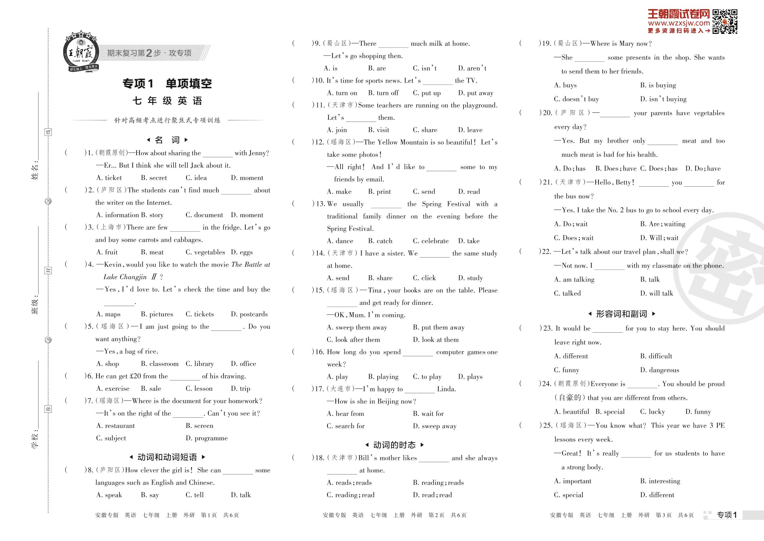王朝霞期末专项卷——单项填空七年级上册英语(外研版)【1】