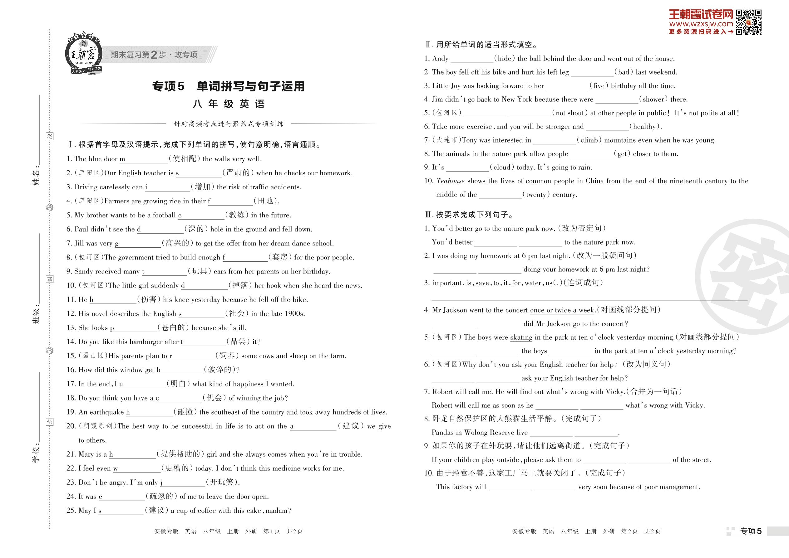 王朝霞期末专项卷——单词拼写与句子运用八年级上册英语(外研版)【5】