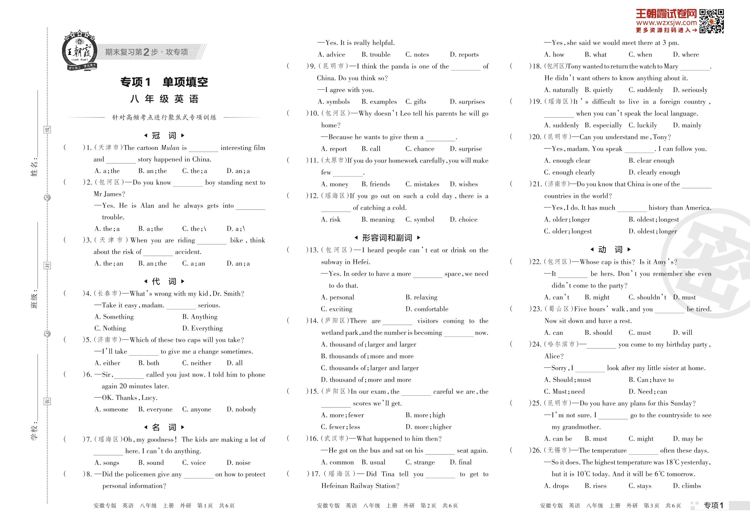 王朝霞期末专项卷——单项填空八年级上册英语(外研版)【1】