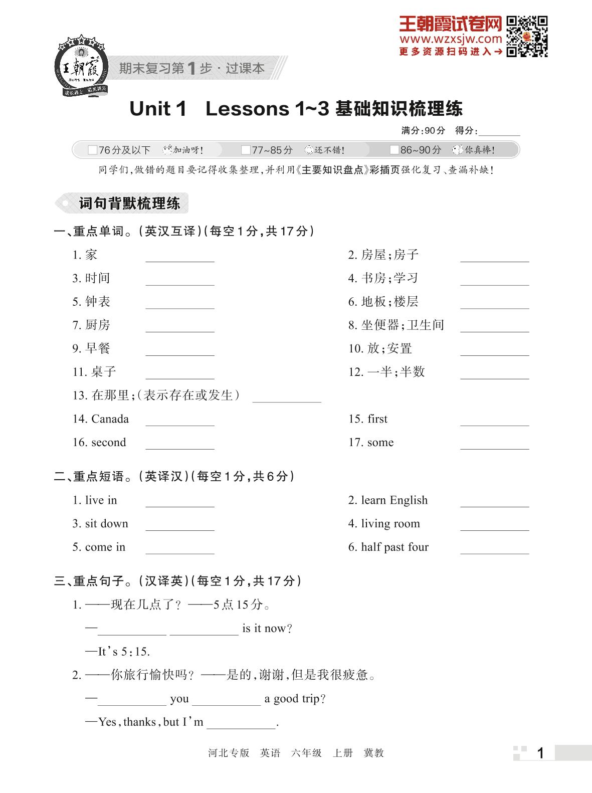 王朝霞期末过课本——Unit 1 Lessons 1~3 基础知识梳理练六年级上册英语(冀教版)