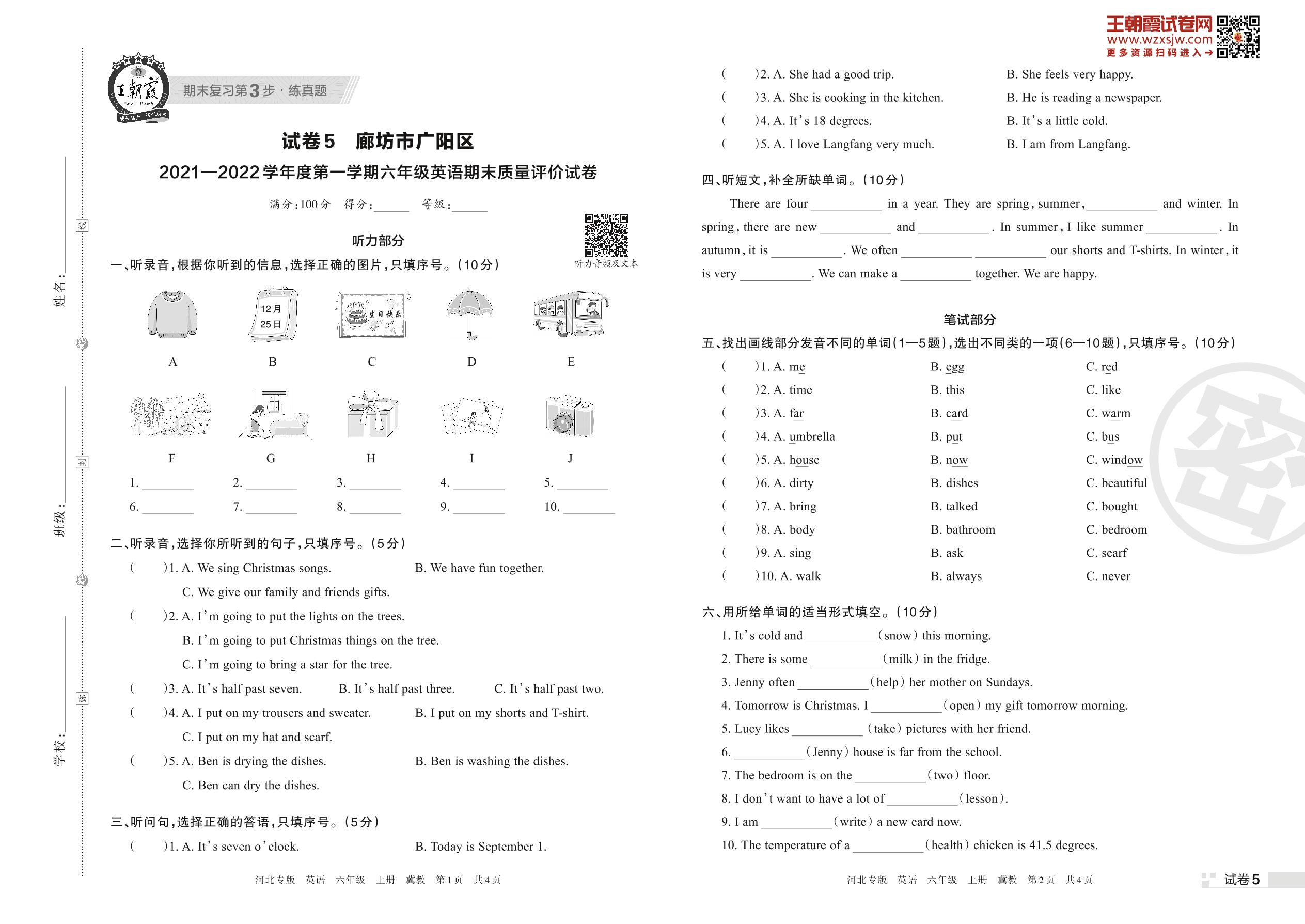 廊坊市广阳区2021—2022学年度第一学期六年级英语期末质量评价试卷(冀教版)【5】