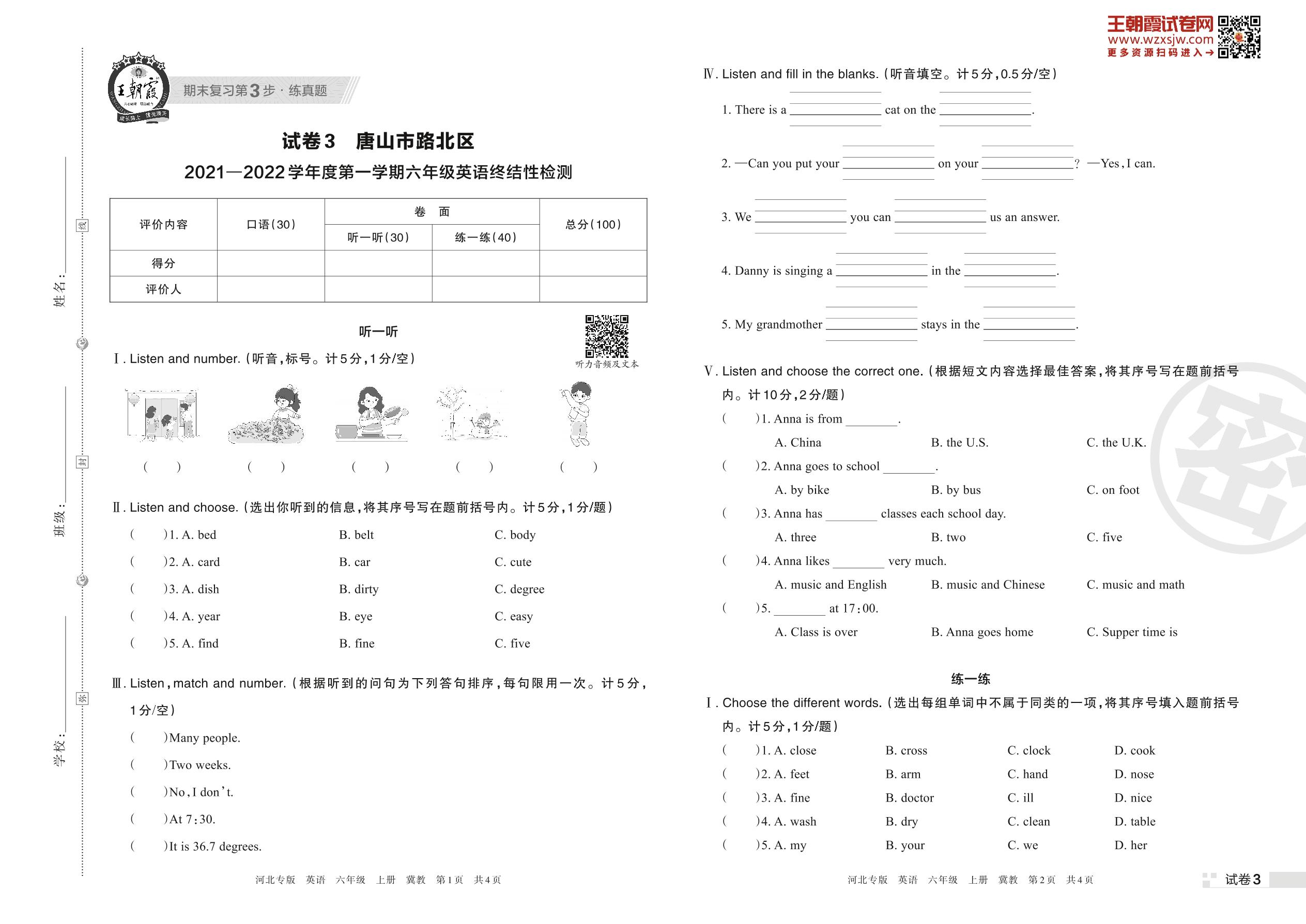 唐山市路北区2021—2022学年度第一学期六年级英语终结性检测(冀教版)【3】