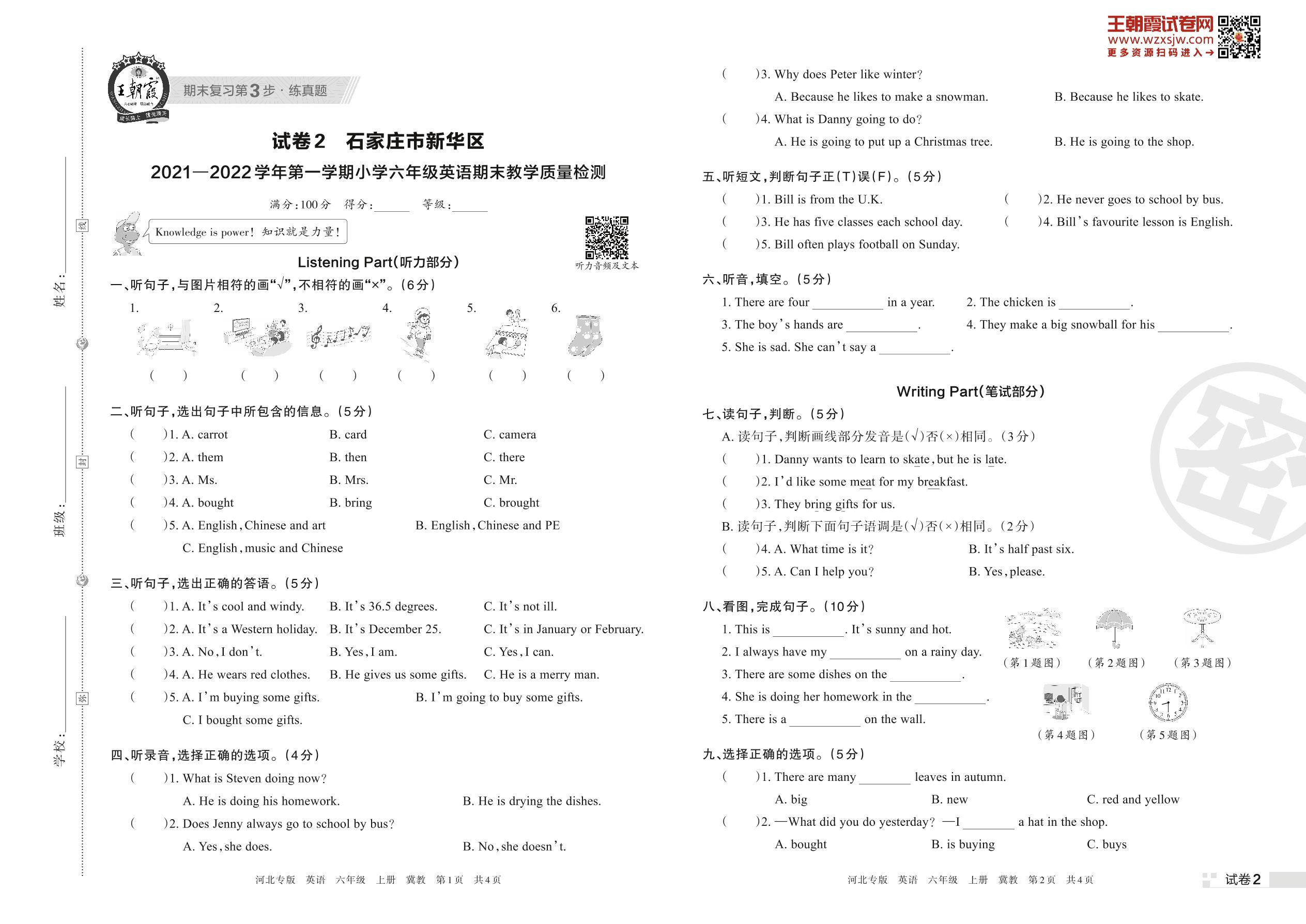 石家庄市新华区2021—2022学年第一学期小学六年级英语期末教学质量检测(冀教版)【2】