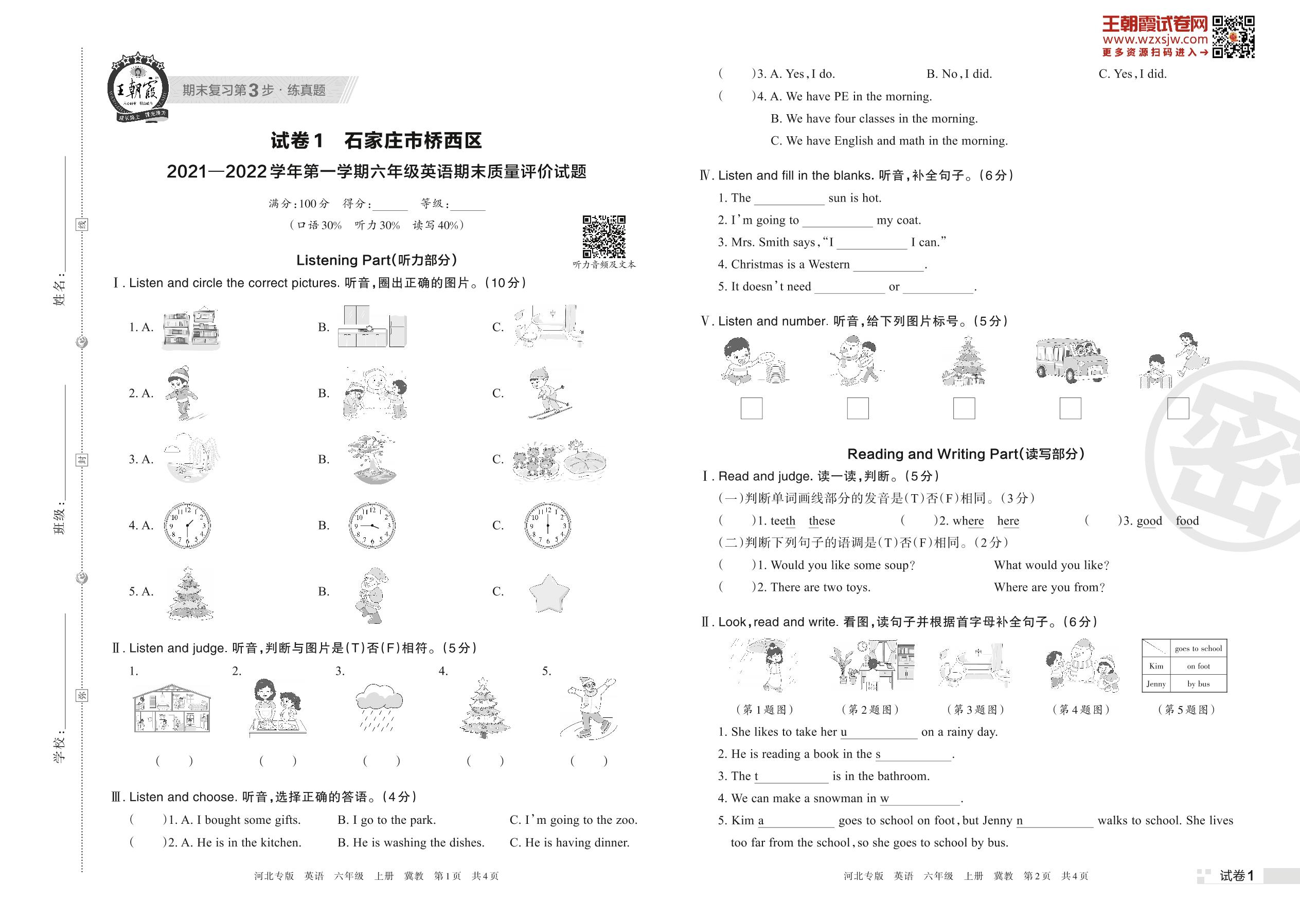 石家庄市桥西区2021—2022学年第一学期六年级英语期末质量评价试题(冀教版)【1】