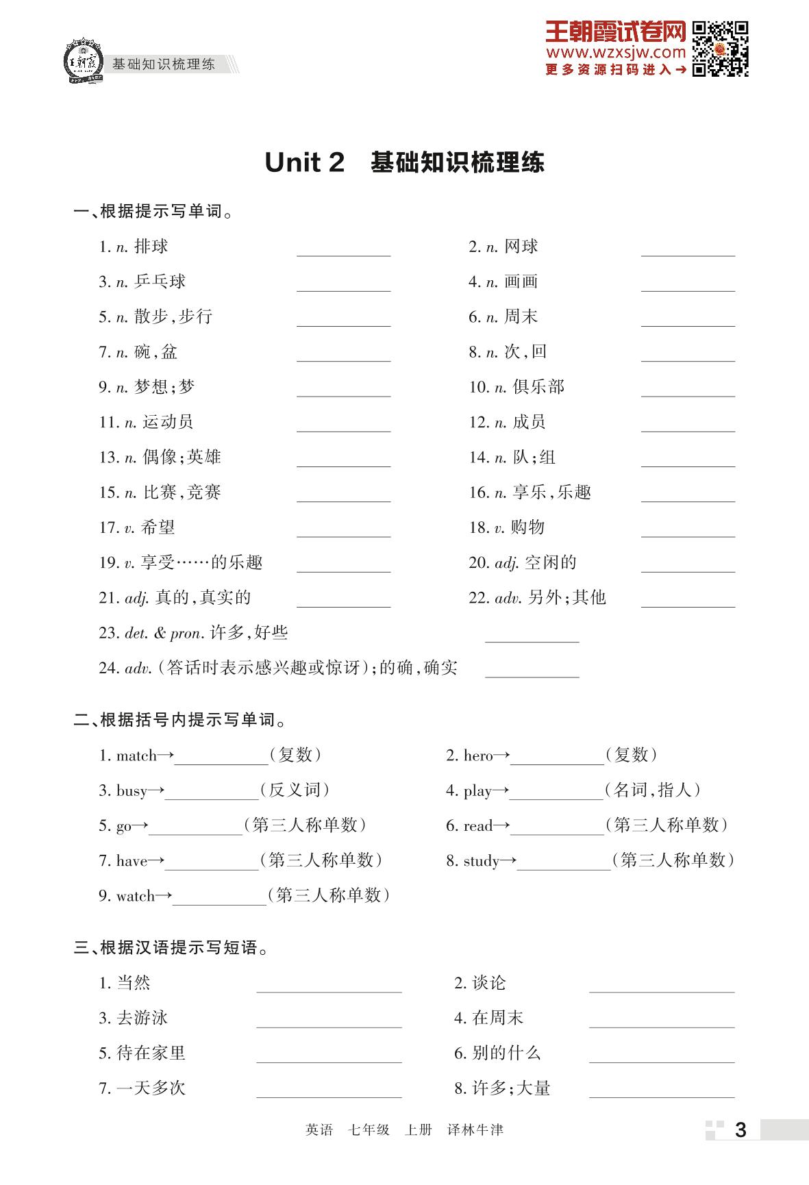 王朝霞期末过课本——Unit 2 基础知识梳理练七年级上册英语(译林牛津版)_R221124155540815