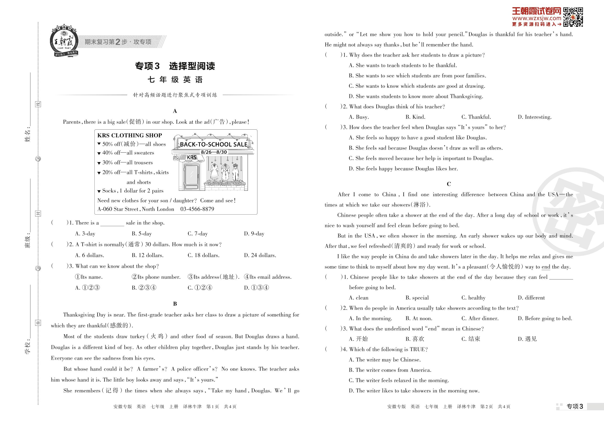 王朝霞期末专项卷——选择型阅读七年级上册英语(译林牛津版)【3】
