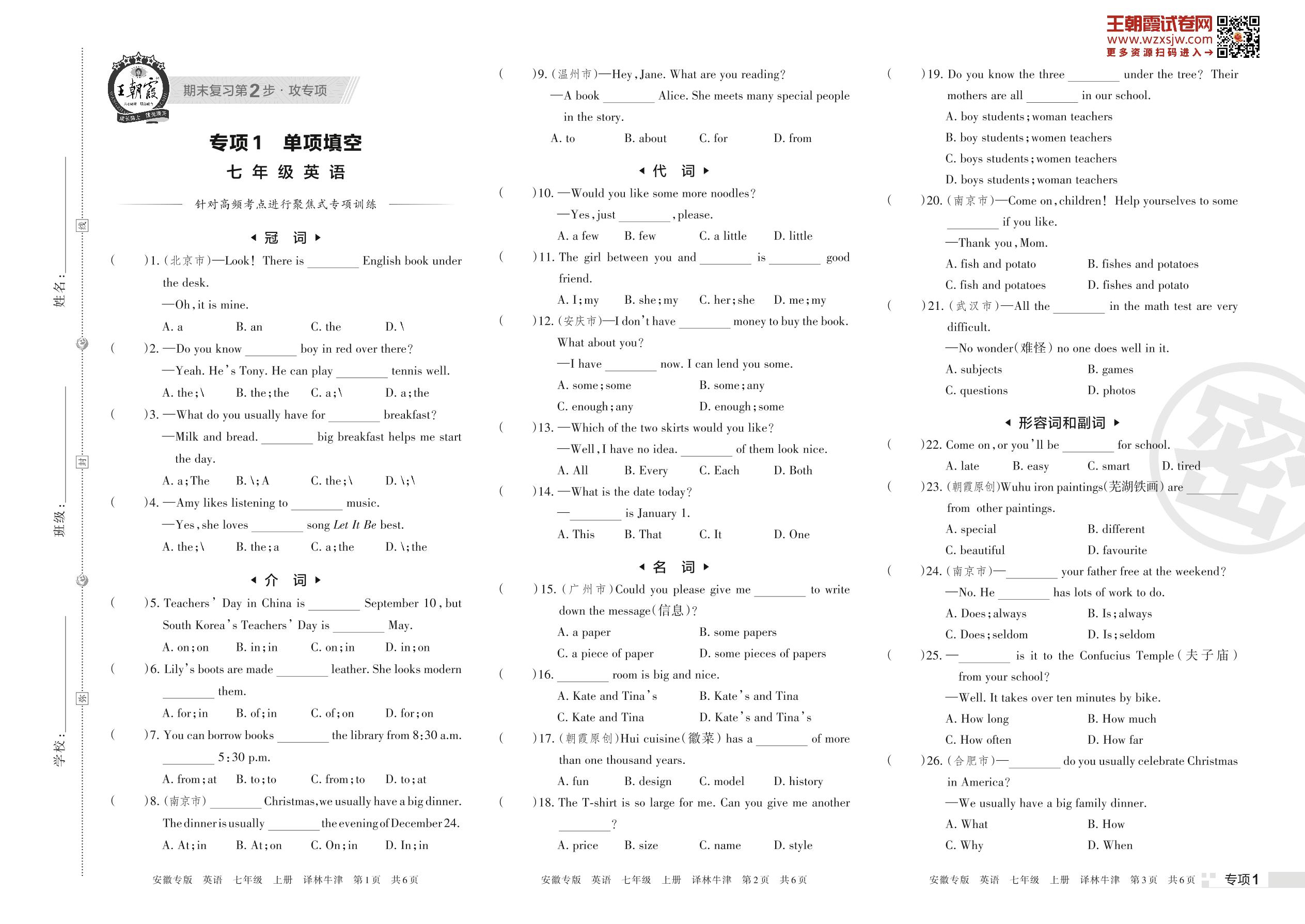 王朝霞期末专项卷——单项填空七年级上册英语(译林牛津版)【1】