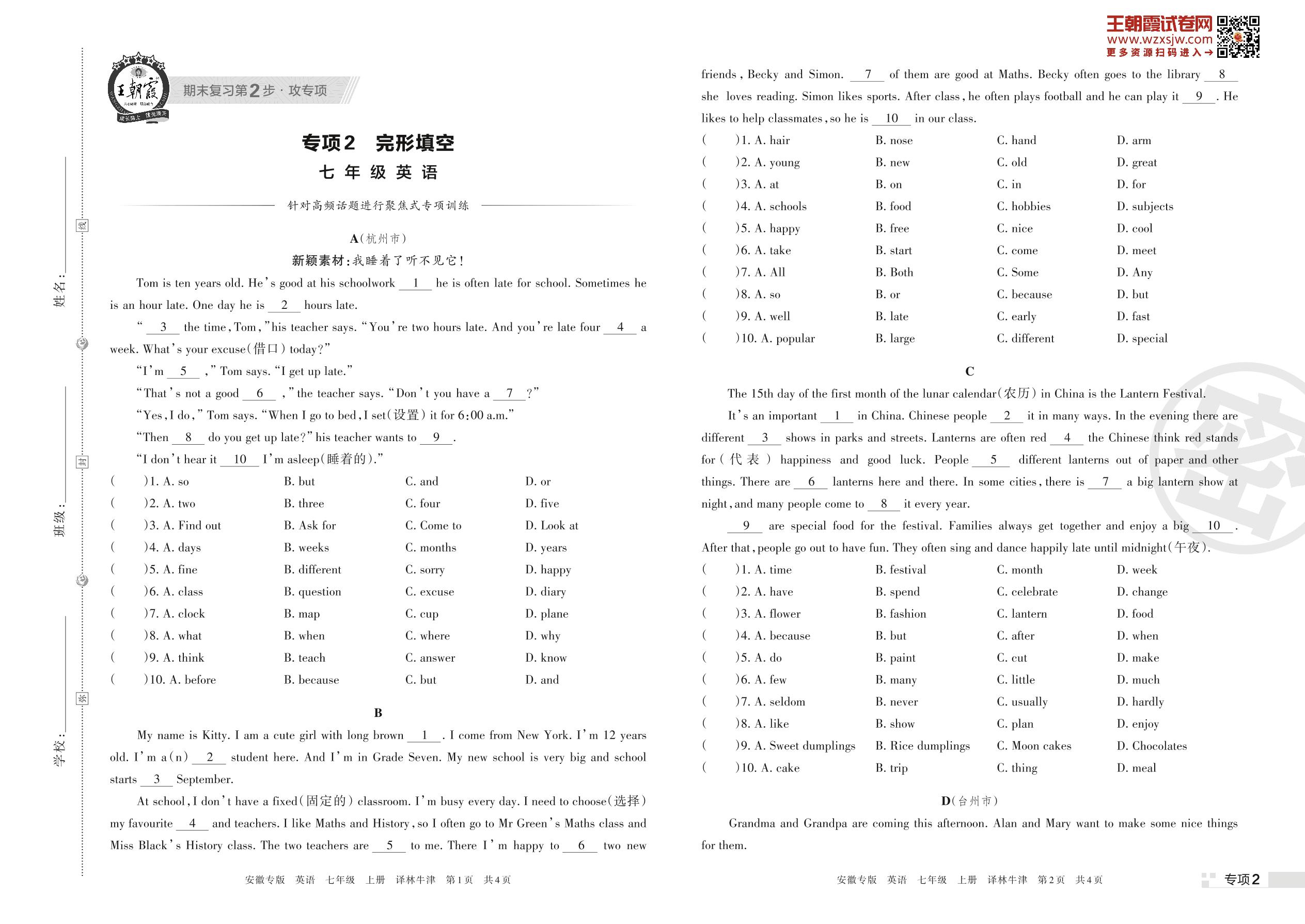 王朝霞期末专项卷——完形填空七年级上册英语(译林牛津版)【2】