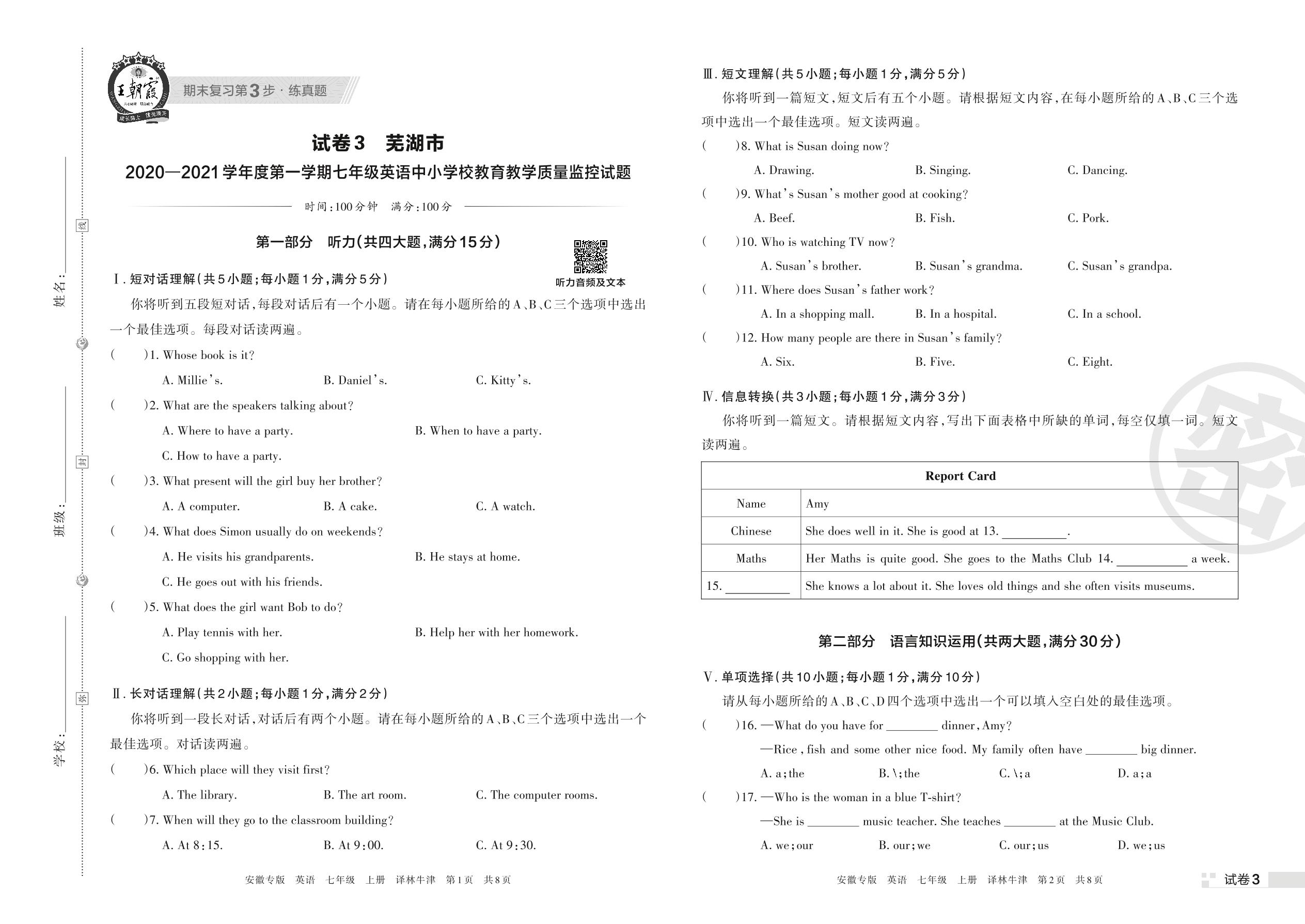芜湖市2020—2021学年度第一学期期末七年级英语中小学校教育教学质量监控试题(译林牛津版)【3】