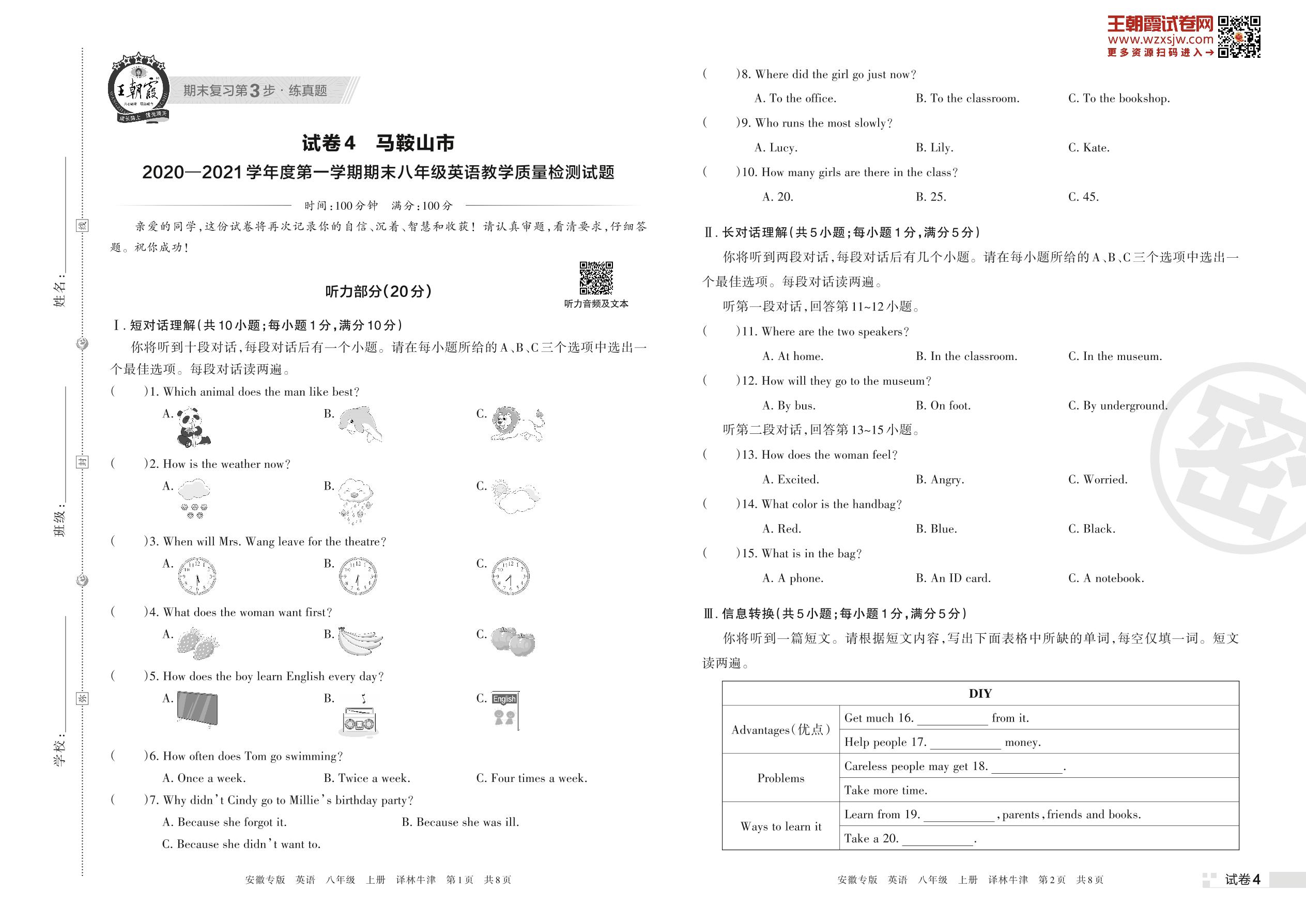 马鞍山市2021—2022学年度第一学期期末八年级英语教学质量检测试题(译林牛津版)【4】