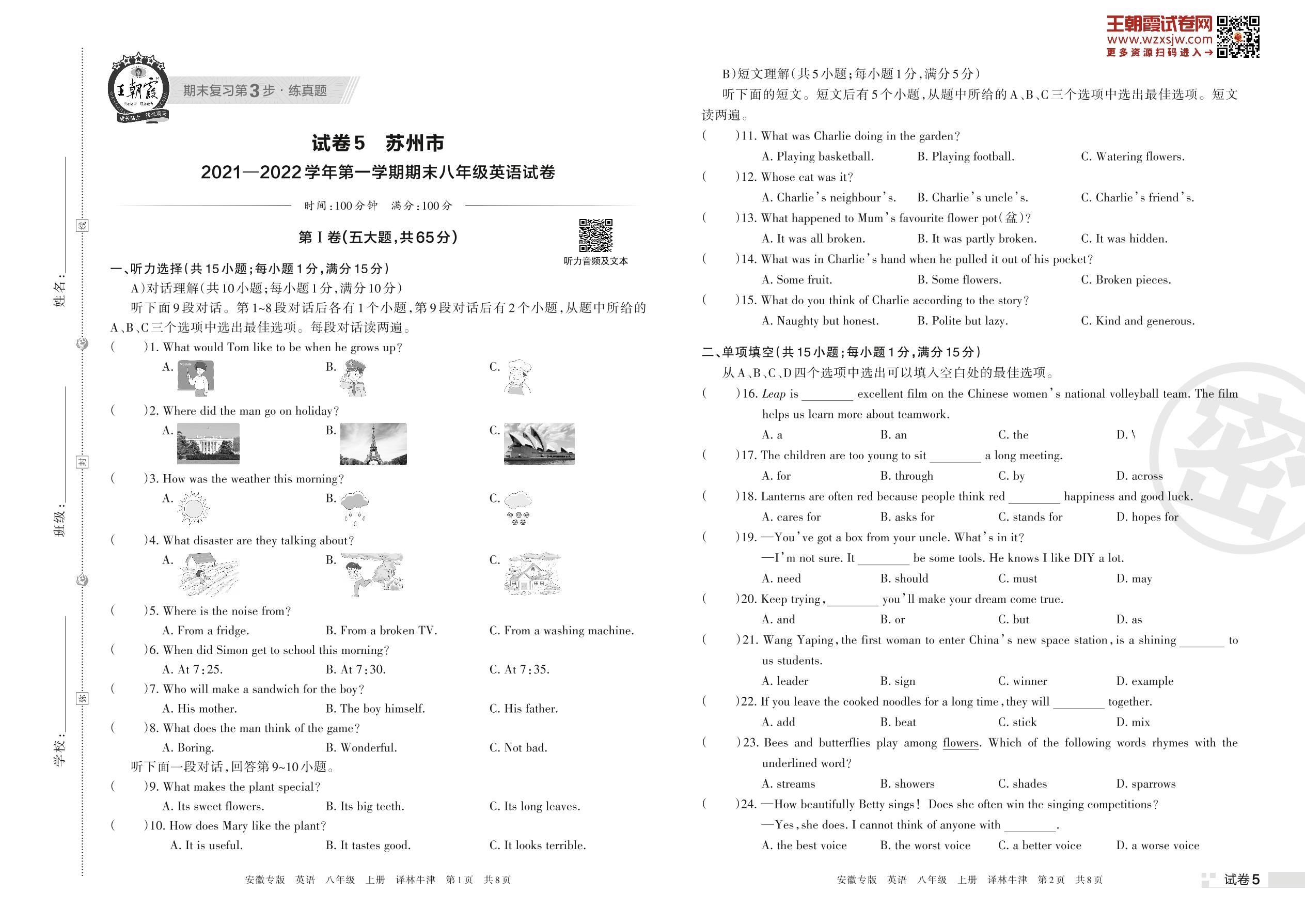 苏州市2021—2022学年第一学期期末八年级英语试卷(译林牛津版)【5】