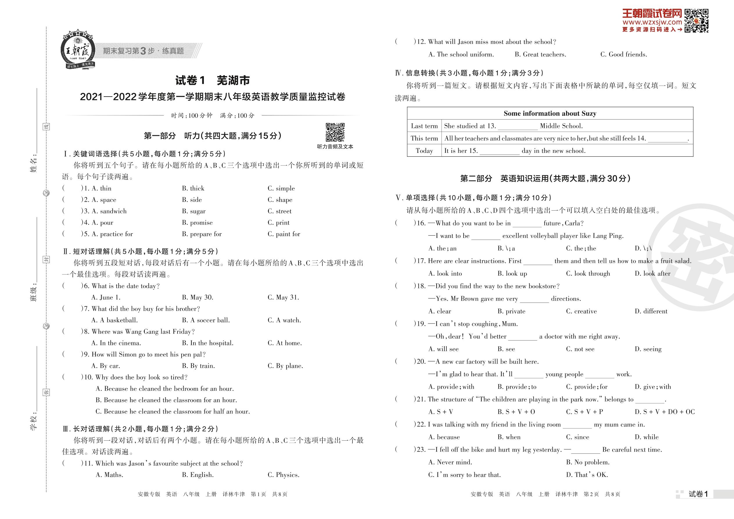 芜湖市2021—2022学年度第一学期期末八年级英语教学质量监控试卷(译林牛津版)【1】