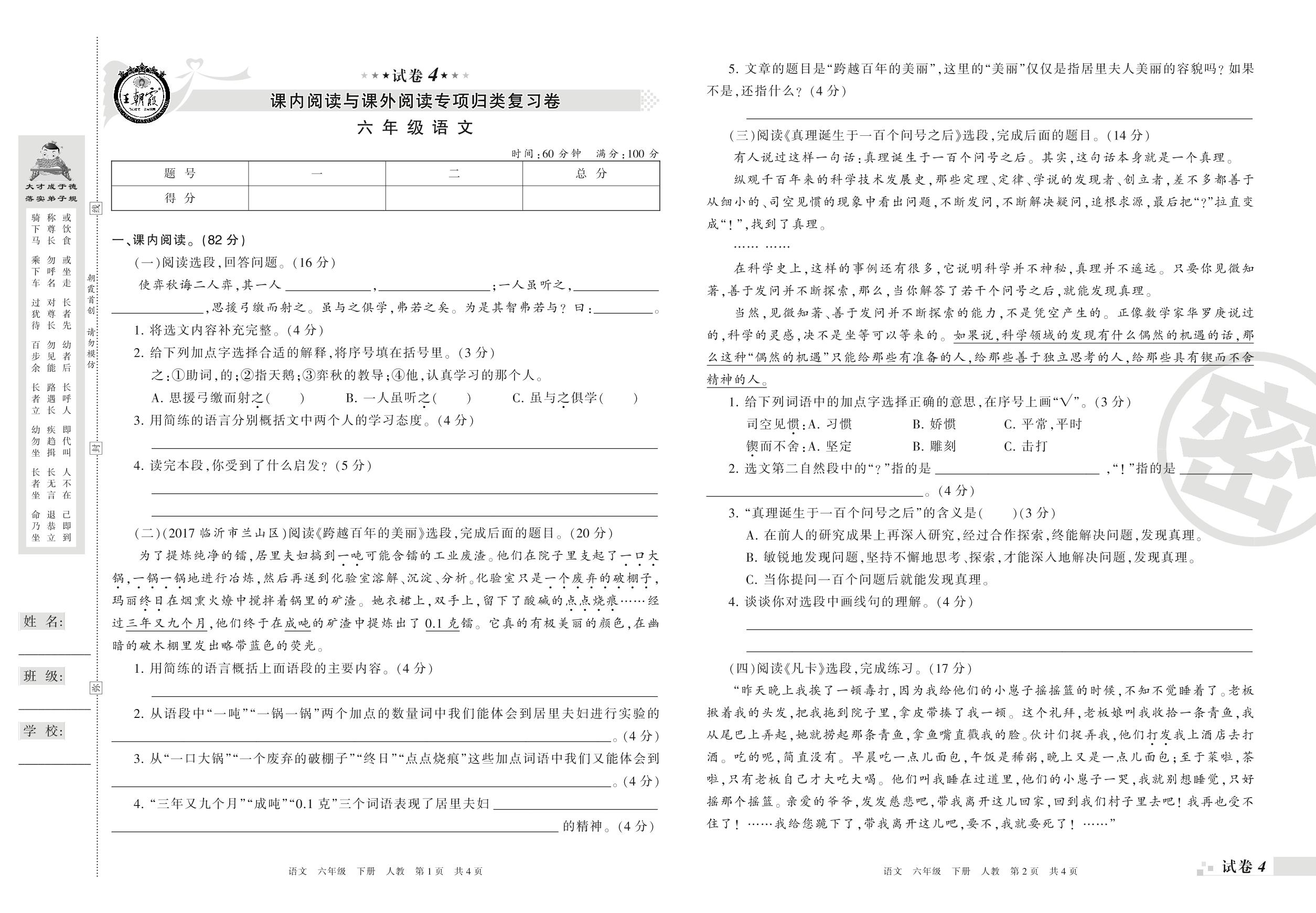 王朝霞期末专项卷——课内阅读与课外阅读专项归类复习卷六年级下册语文(人教版)_R210802120359【4】