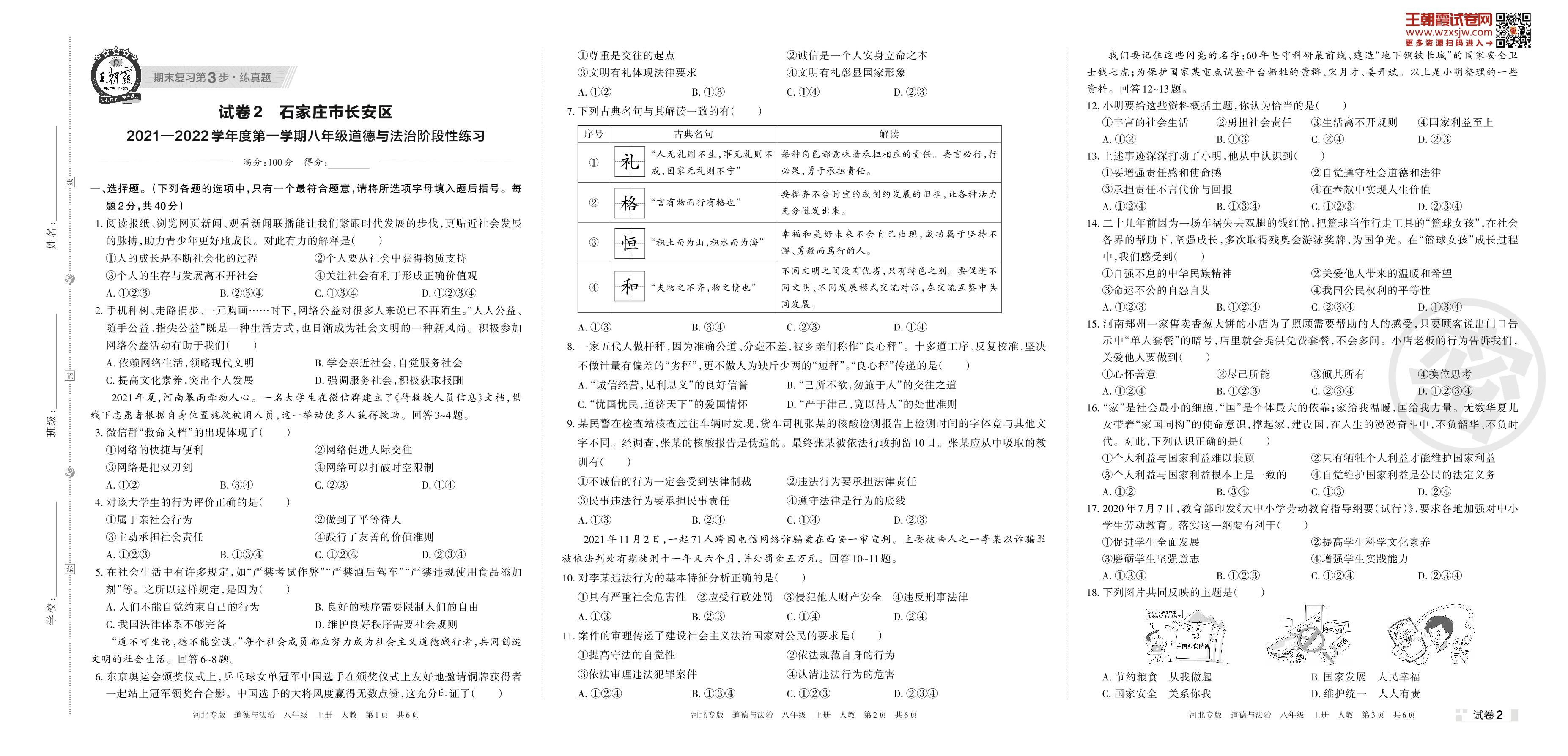 石家庄市长安区2021—2022学年度第一学期八年级道德与法治阶段性练习(人教版)【2】