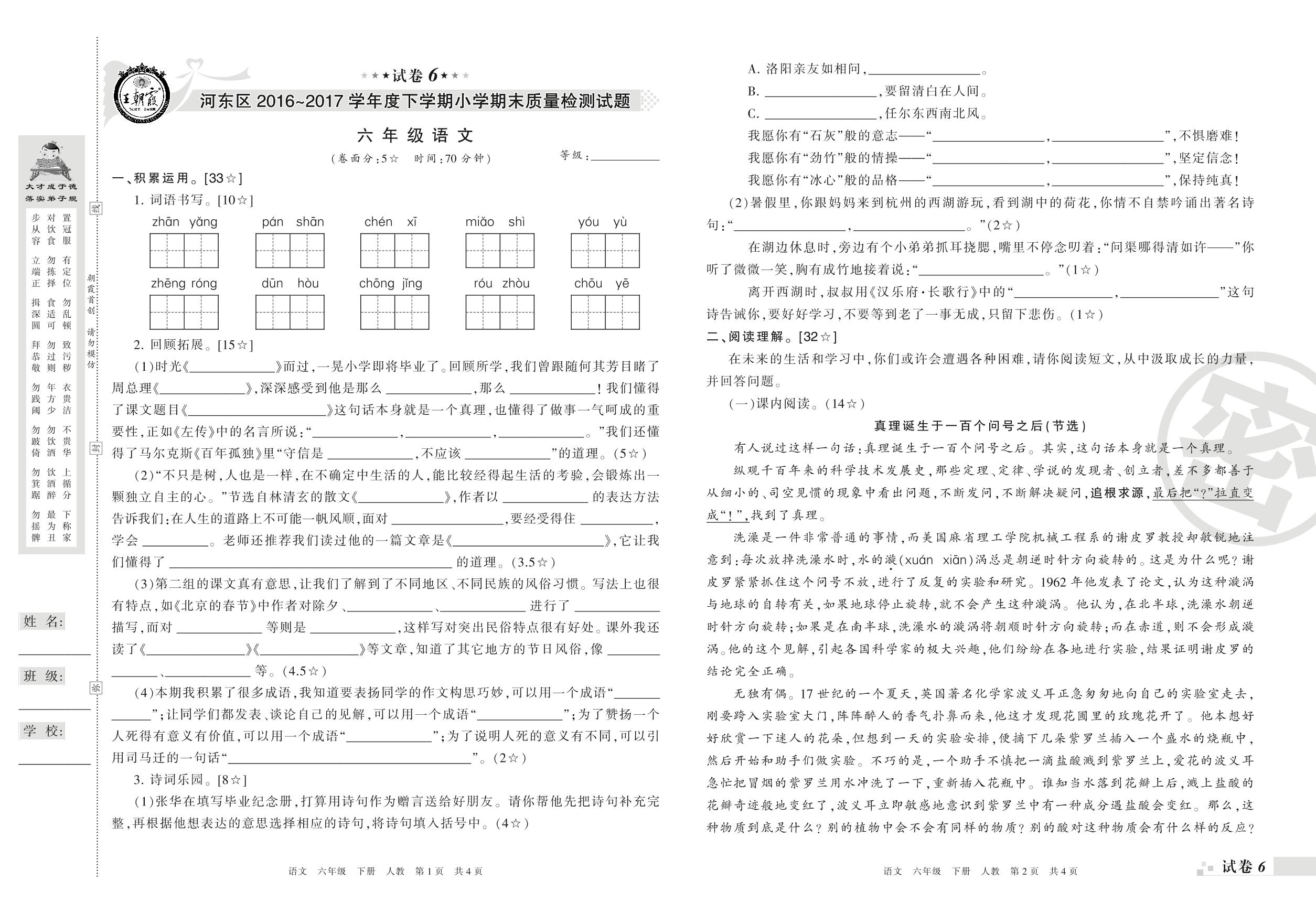 2016-2017学年第二学期临沂市河东区六年级语文试卷(人教版)【6】