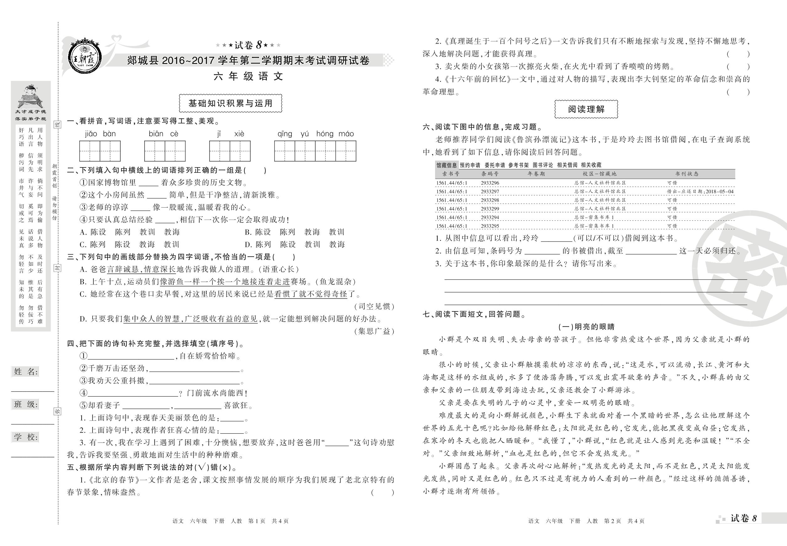 2016-2017学年第二学期临沂市郯城县六年级语文试卷(人教版)【8】