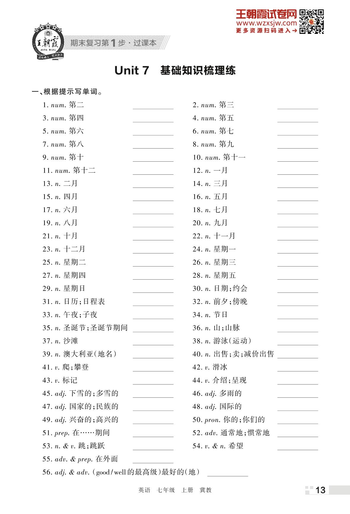 王朝霞期末过课本——Unit 7 基础知识梳理练七年级上册英语(冀教版)