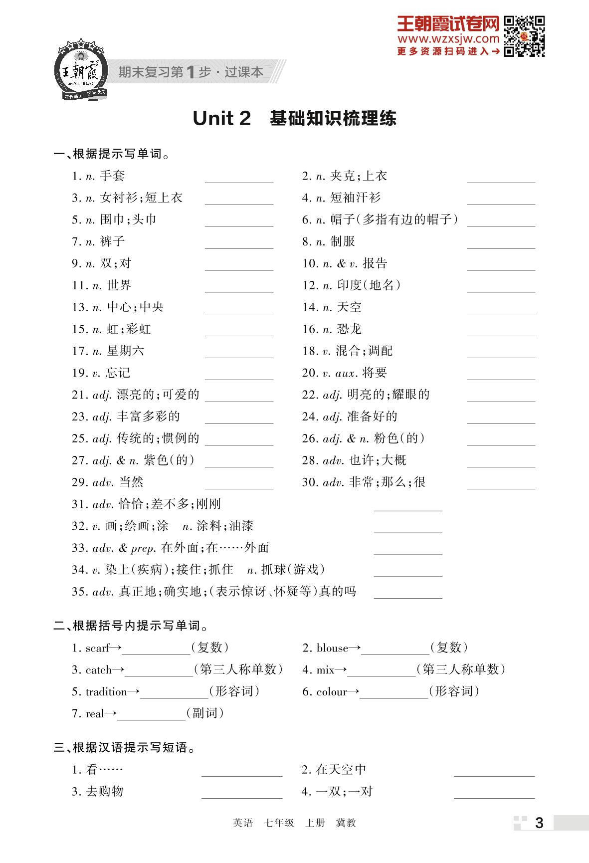 王朝霞期末过课本——Unit 2 基础知识梳理练七年级上册英语(冀教版)