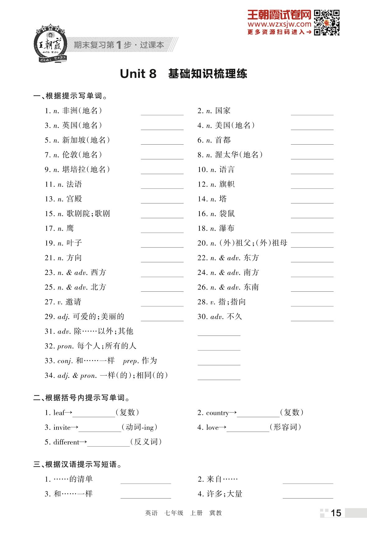 王朝霞期末过课本——Unit 8 基础知识梳理练七年级上册英语(冀教版)
