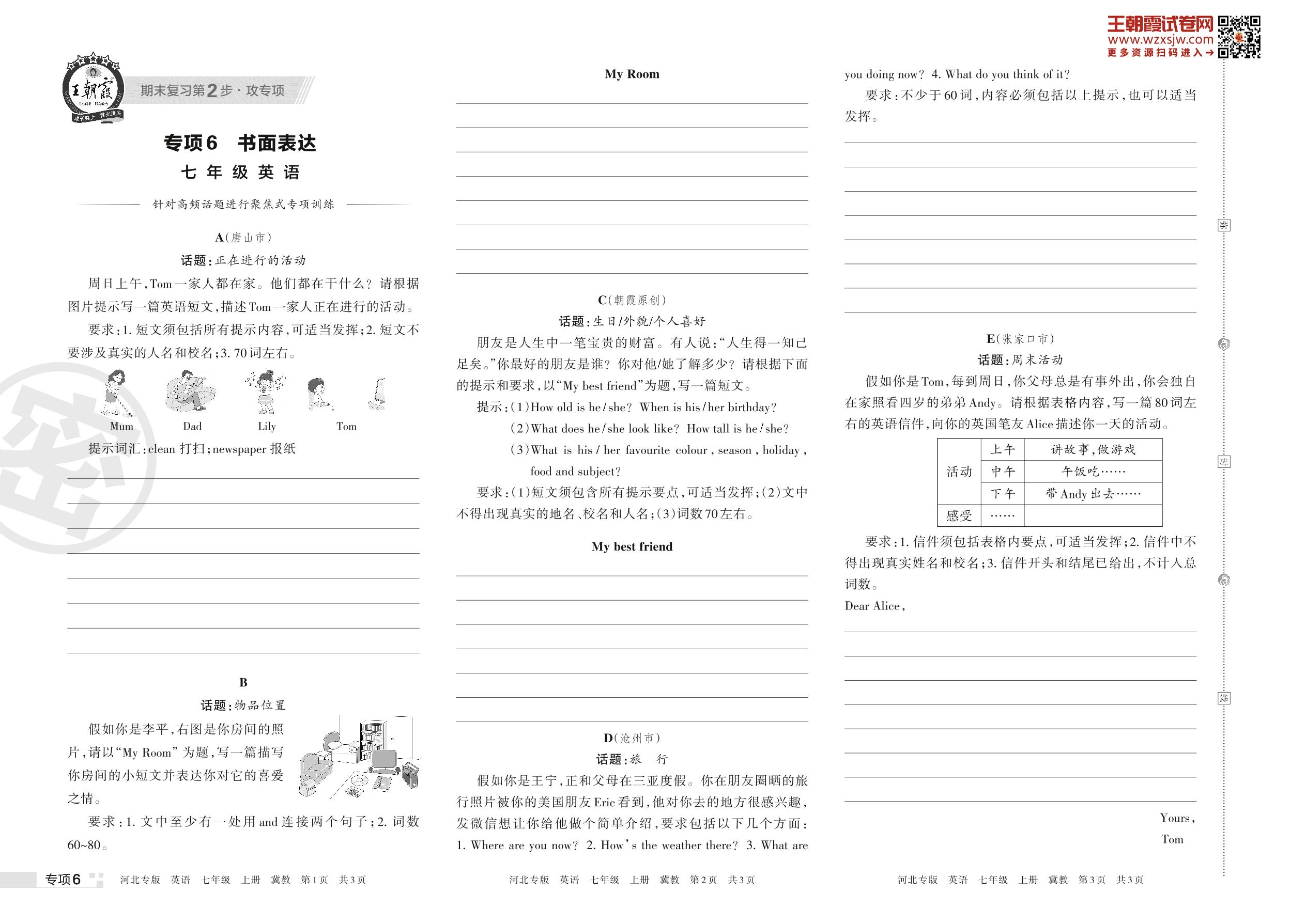 王朝霞期末专项卷——书面表达七年级上册英语(冀教版)【6】
