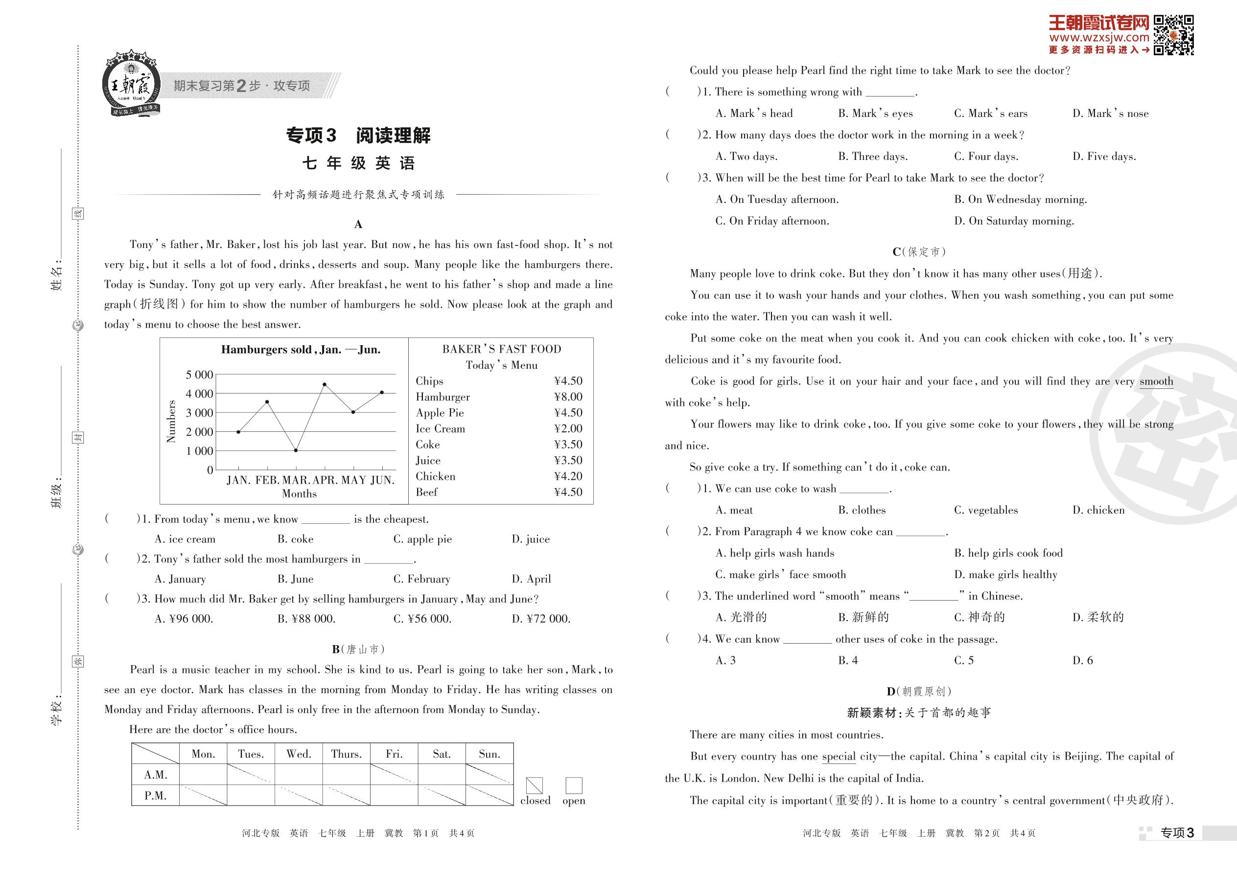 王朝霞期末专项卷——阅读理解七年级上册英语(冀教版)【3】